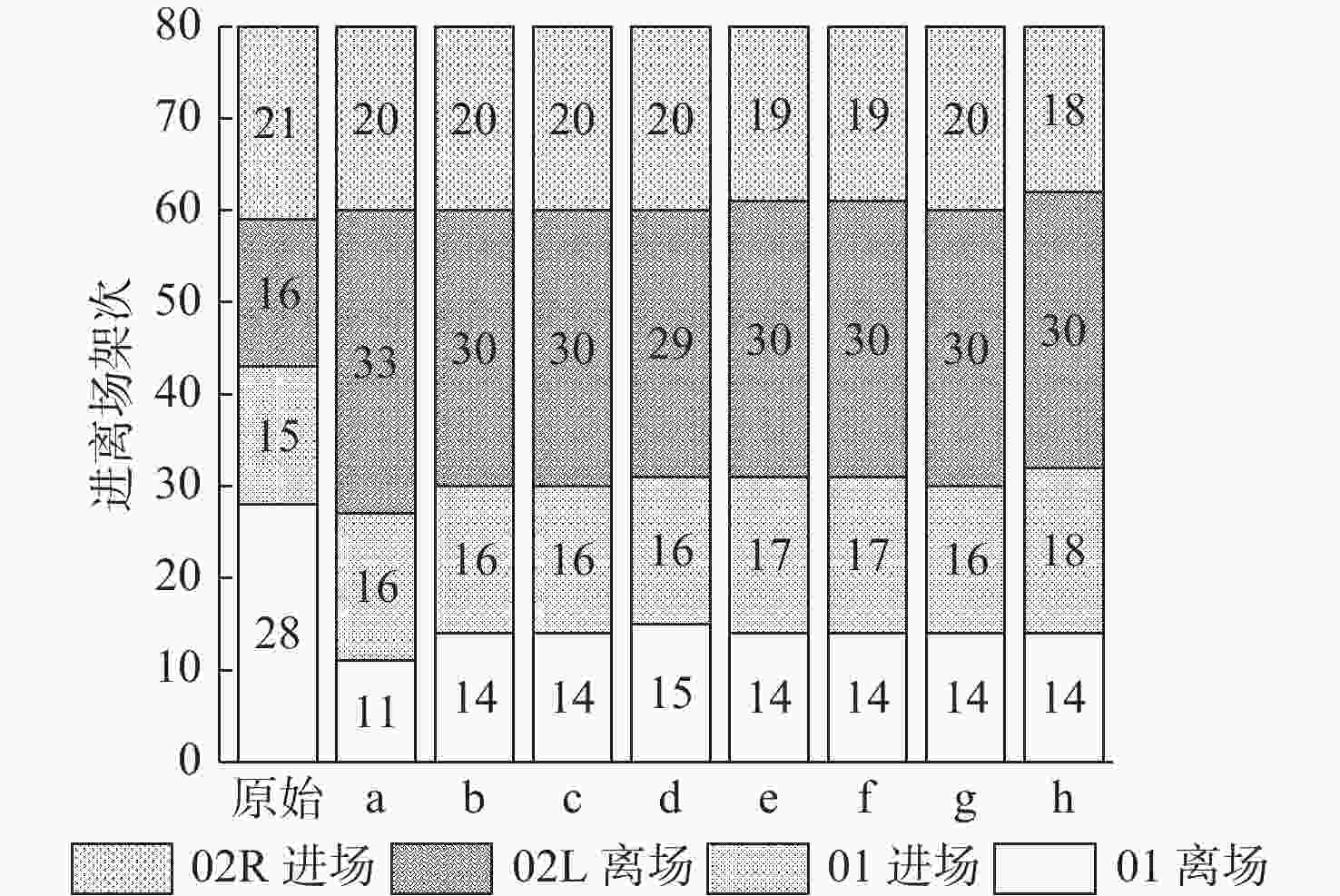 飞行时间式(5)权重 优先级 权重 优先级 权重 优先级 a 首先 其次 b 2.0 1.0 c 1.0 1.0 d 1.0 2.0 e 其次 再次 首先 f 1.0 1.0 首先 g 再次 其次 首先 h 其次 首先 表 4 进场调度与进离场调度结果对比