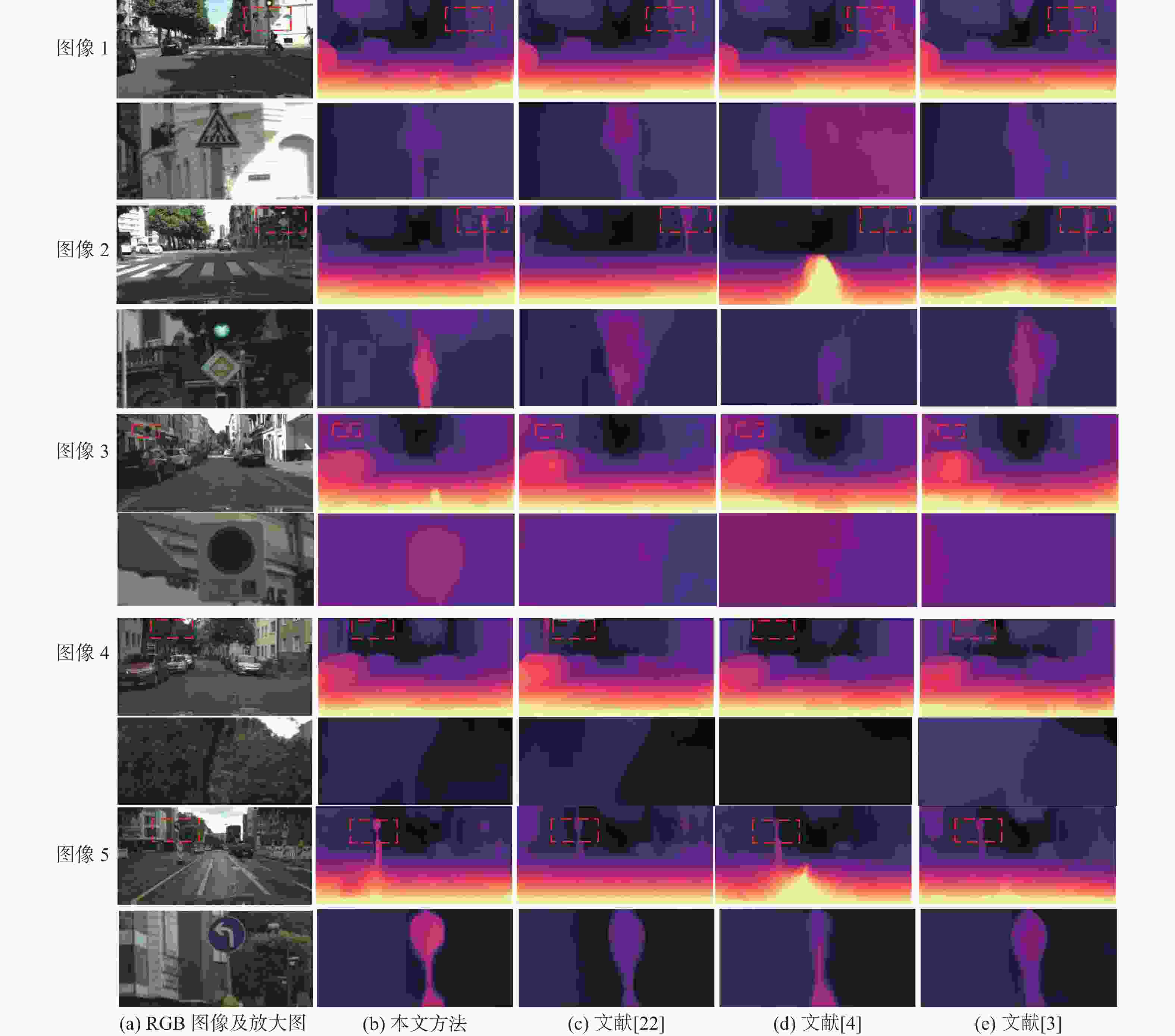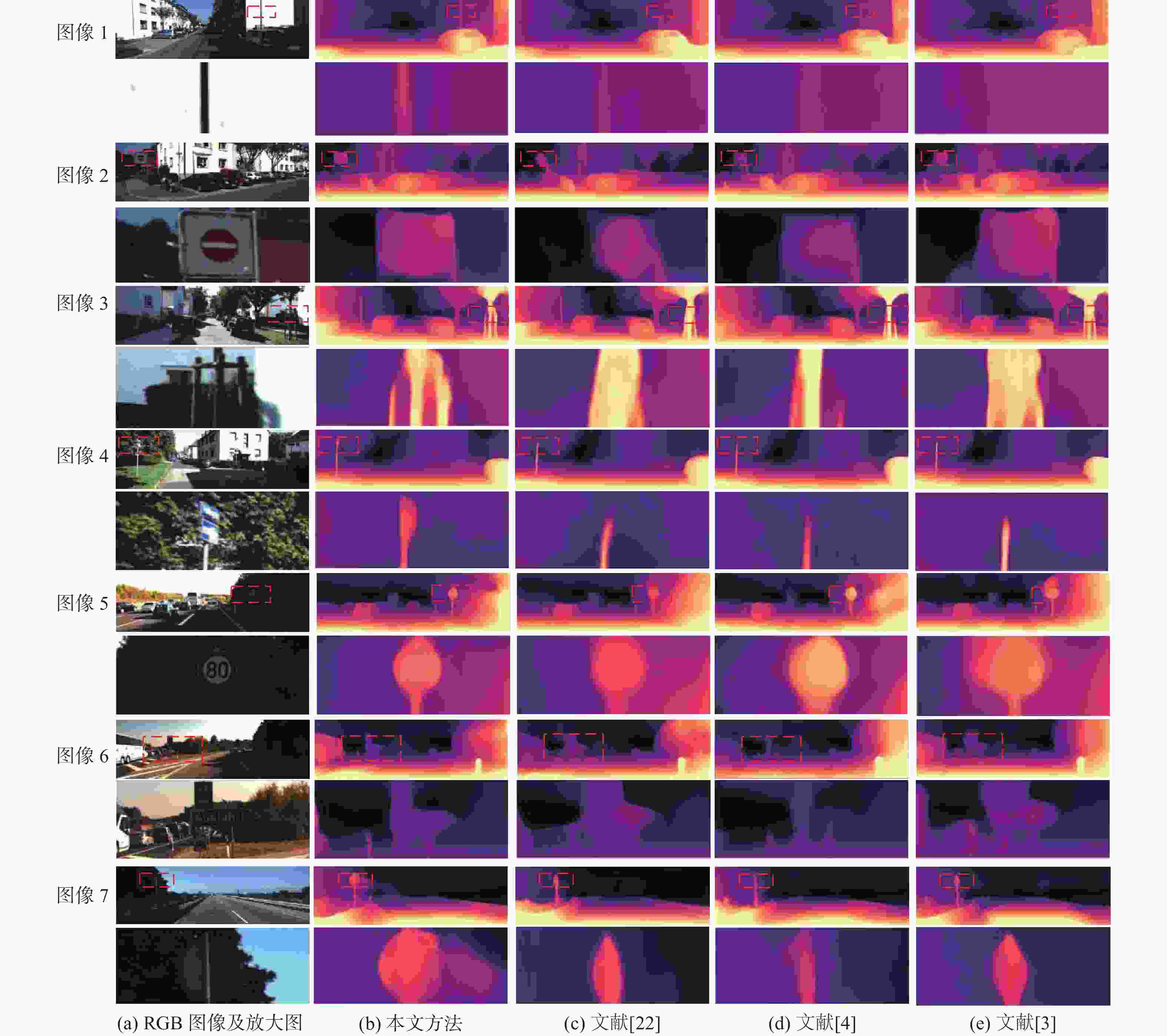 方法 训练方法 LAbs LSq LRMS LRMSlog $ \delta<1.25 $ $ \delta < 1.25^{2} $ $ \delta < 1.25^{3} $ 文献[3] M 0.114 0.864 4.817 0.192 0.877 0.959 0.981 文献[12] M 0.115 0.871 4.778 0.191 0.874 0.963 0.984 文献[13] M 0.120 0.896 4.869 0.198 0.868 0.957 0.981 文献[14] M+Se 0.113 0.835 4.693 0.191 0.879 0.961 0.981 文献[15] M+Se 0.112 0.777 4.772 0.191 0.872 0.959 0.982 文献[16] M 0.111 0.863 4.756 0.188 0.881 0.961 0.982 文献[17] M 0.111 0.821 4.650 0.187 0.883 0.961 0.982 文献[18] M+Se 0.112 0.788 4.582 0.187 0.878 0.963 0.983 文献[19] M 0.109 0.792 4.632 0.185 0.884 0.962 0.983 文献[20] M 0.110 0.812 4.686 0.187 0.882 0.962 0.983 文献[21] M+Se 0.105 0.722 4.547 0.182 0.886 0.964 0.984 文献[22] M 0.107 0.765 4.561 0.183 0.886 0.961 0.982 文献[23] M 0.113 0.851 4.809 0.191 0.877 0.959 0.981 文献[24] M 0.100 0.805 4.678 0.187 0.879 0.961 0.983 文献[25] M 0.111 0.829 4.393 0.185 0.883 0.961 0.983 文献[26] M 0.100 0.747 4.455 0.177 0.895 0.966 0.984 文献[27] M 0.102 0.757 4.493 0.178 0.896 0.965 0.984 文献[4] M 0.098 0.770 4.459 0.176 0.900 0.965 0.983 本文 M 0.094 0.703 4.349 0.174 0.907 0.966 0.984 注:粗体表示最优结果,下划线表示次优结果。M表示以单目视频为训练集训练,Se表示使用语义标签作为监督训练。 表 2 消融实验结果