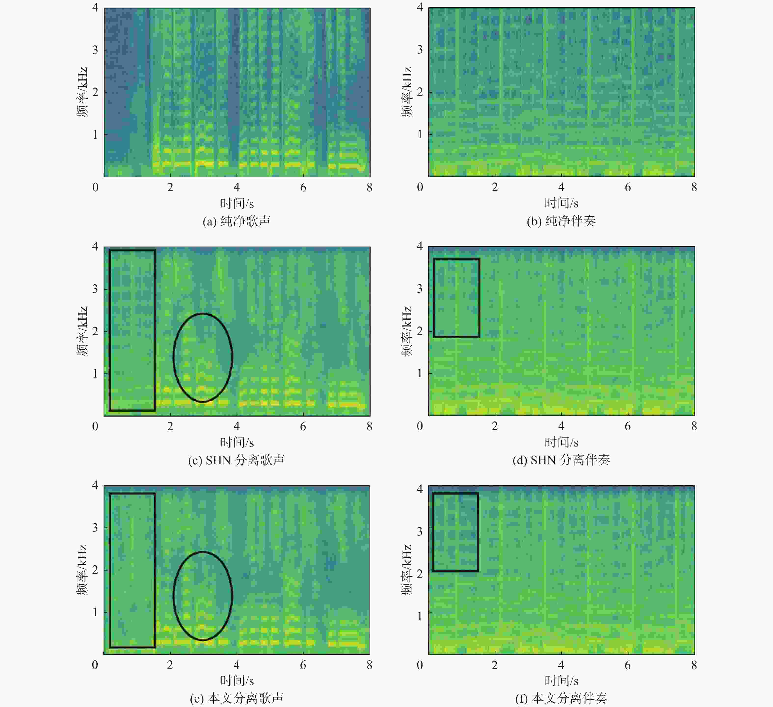 dB 网络模型 GNSDR GSIR GSAR 歌声 伴奏 歌声 伴奏 歌声 伴奏 SHN[13] 10.51 9.88 16.01 14.24 12.53 12.36 GAC-SHN 11.98 10.65 18.35 14.73 13.45 12.78 GA-SHN 10.89 10.32 17.64 14.36 12.76 12.66 GAC-GA-SHN 12.01 10.69 18.25 14.78 13.66 12.91 GAC-GA-SA-SHN(本文) 12.24 10.73 18.85 14.88 13.64 13.31 表 4 MIR-1K数据集上不同方法的分离性能比较[9,14-16,19-21]