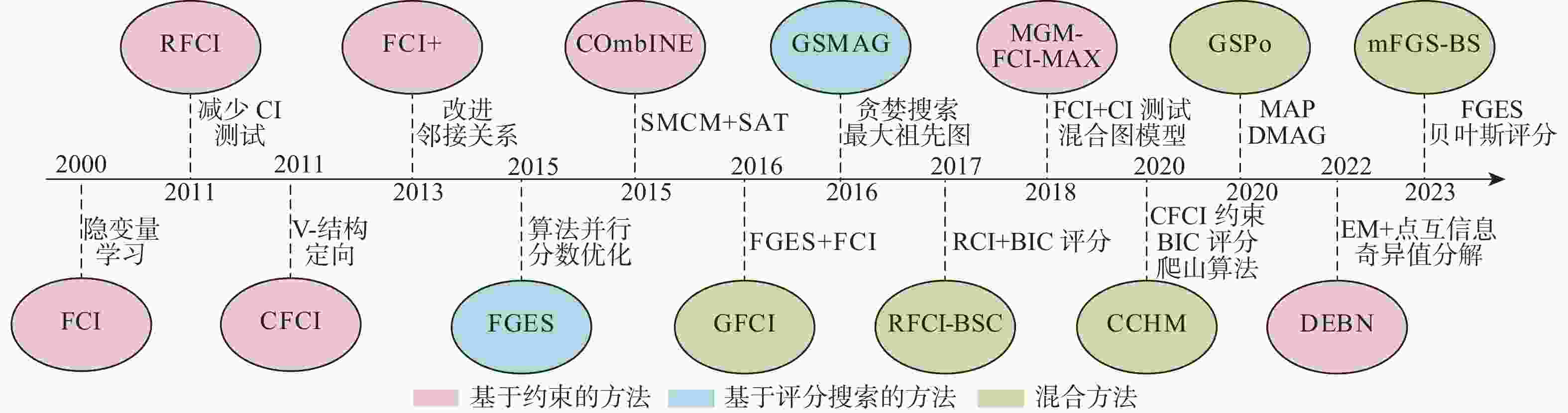 (大型父节点集)2000 FCI 基于PC算法,通过验证部分祖先图中的2个邻接顶点的CI测试,进而寻找超集D-Sep(A,B)来消除隐变量带来的影响,相比于PC算法更具有普适性,是用于学习含有隐变量数据集的经典约束型算法 适用于非完备的大型数据集 2002 TPDA TPDA基于SGS算法,使用V-结构和定向相位来定向边缘,减少了所需CI测试数量的限制,相较于传统PC算法具有更高的准确性 适用于完备的大型数据集 2006 RAI CI测试方式与PC算法类似,在高阶数据集中,相较于PC算法具有更快的运算速度 适用于完备的大型数据集 2010 HPC 区别于大多基于约束的全局搜索算法,采用局部搜索方式,CI测试每次添加新变量时都执行消除步骤,能够更好地处理小样本数据集,但在高阶数据集中学习效率低 只适用于完备的小样本集 2011 RFCI 基于FCI算法,仅利用邻接阶段节点父级的条件集进行学习,并且修改了V-结构的定向规则,从而减少了高阶CI测试量,有效提高了FCI算法的运算速度 适用于非完备的大型数据集 2013 LMM 专用于解决小样本数据情况下网络结构学习正确率低的问题 只适用于完备的数据有限的
