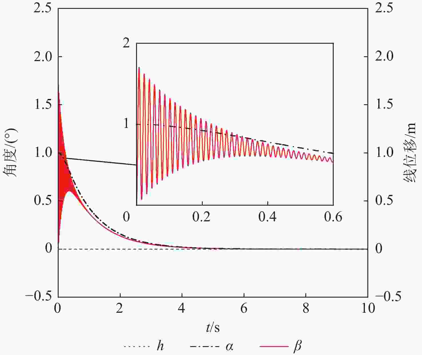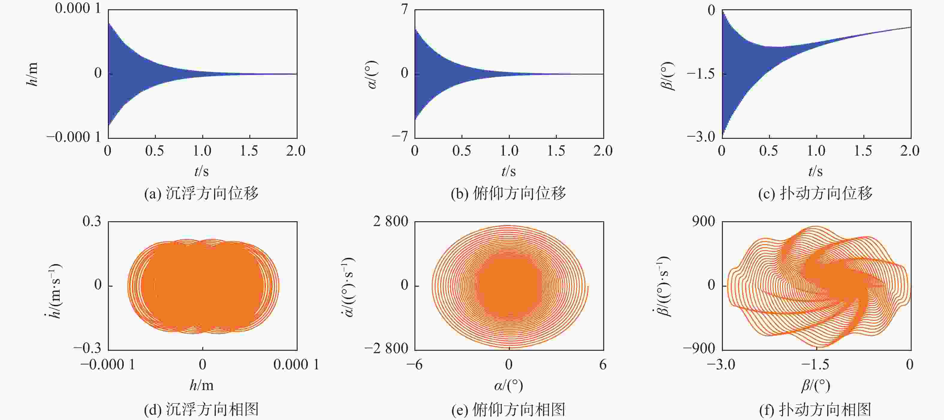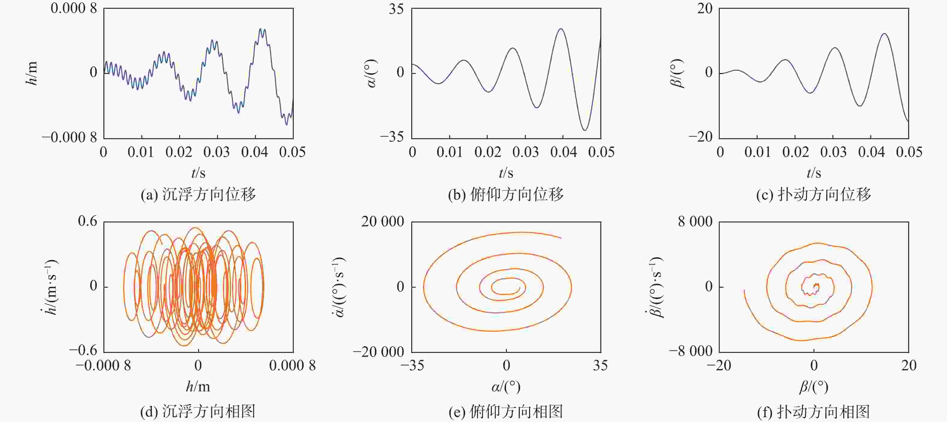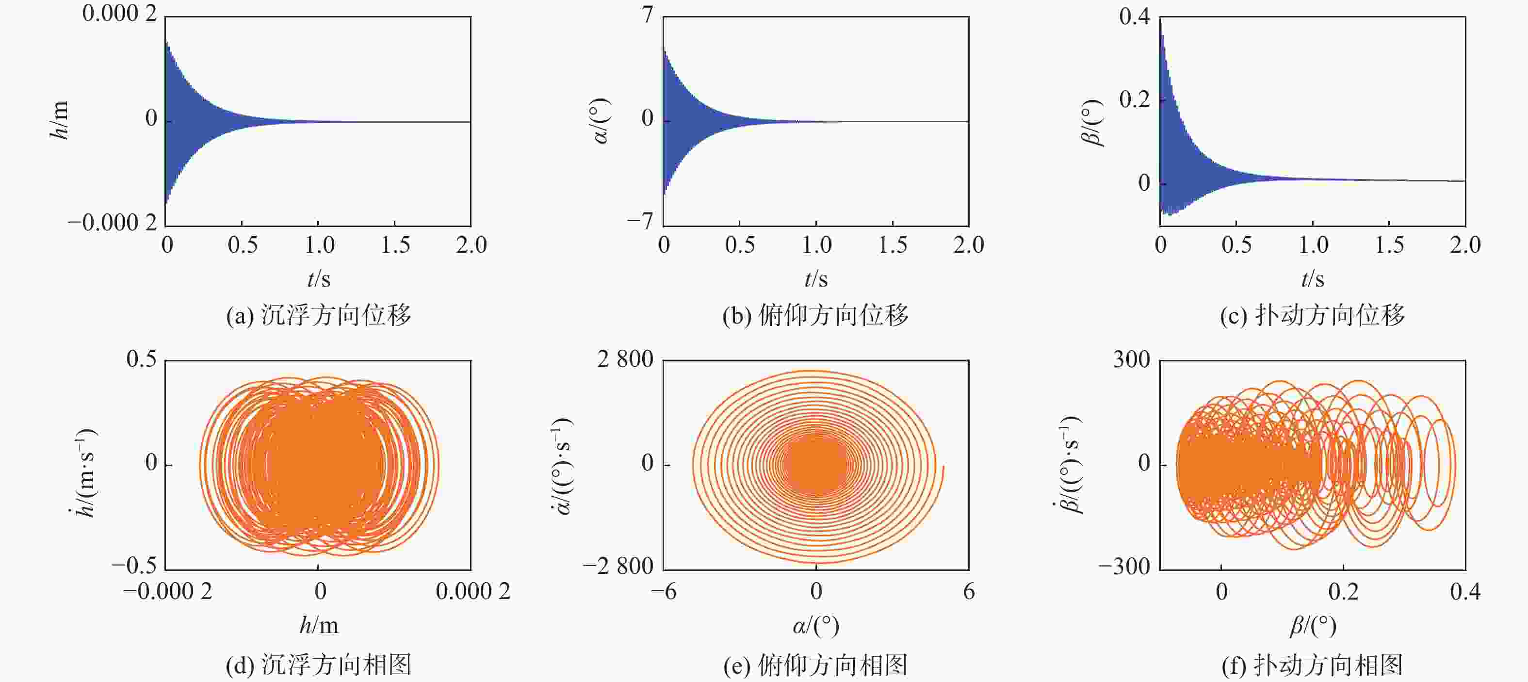 参数 数值 内舵相对坐标原点绕y轴转动惯量Iyyin/(kg·m2) 0.0039 外舵的质量mout/kg 13.60 外舵质心位置的x坐标${\bar x_{{\text{out}}}}$/m 0.0471 外舵质心位置的y坐标${\bar y_{{\text{out}}}}$/m 0.112 外舵相对坐标原点绕x轴转动惯量Ixxout/(kg·m2) 0.2467 外舵相对坐标原点绕y轴转动惯量Iyyout/(kg·m2) 0.2205 外舵相对坐标原点xy惯量积Ixyout/(kg·m2) 0.1154 折叠机构沉浮线弹簧连接刚度Kh/(N·m−1) 1×108 折叠机构俯仰扭簧连接刚度Kα/((N·m)·rad−1) 5×104 折叠机构扑动扭簧连接刚度Kβ/((N·m)·rad−1) 4×104 表 2 折叠舵模态频率的本文方法与Nastran结果
