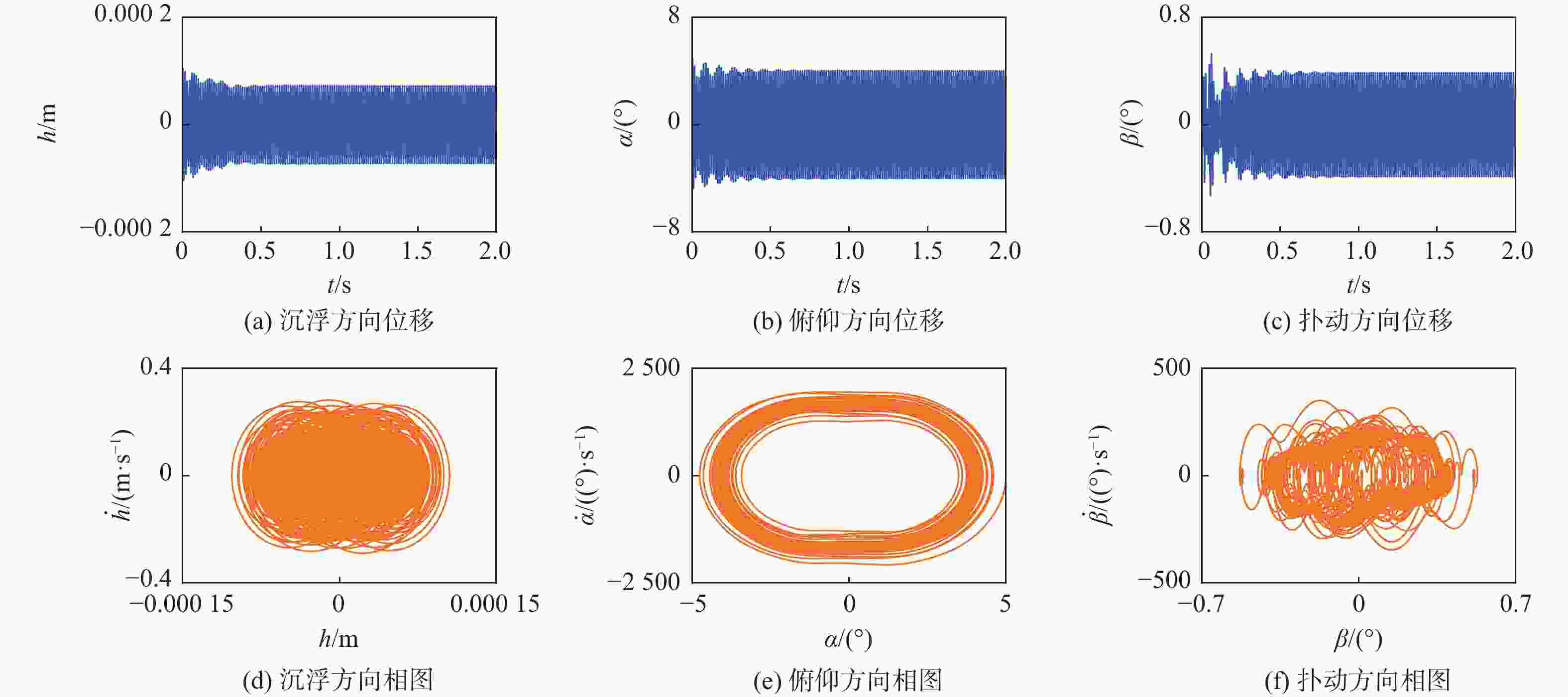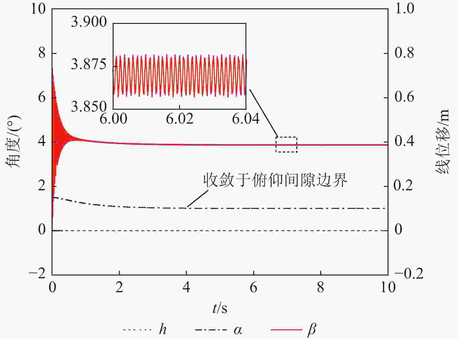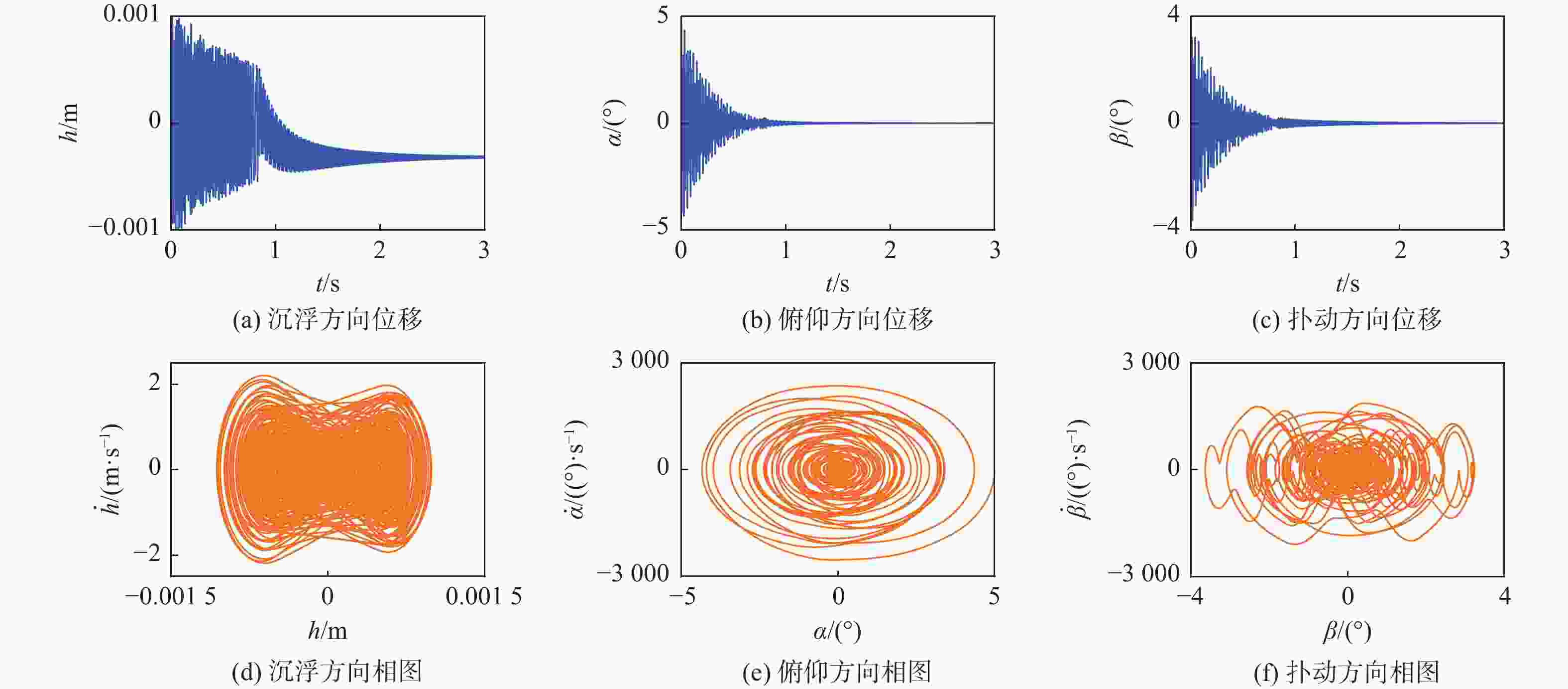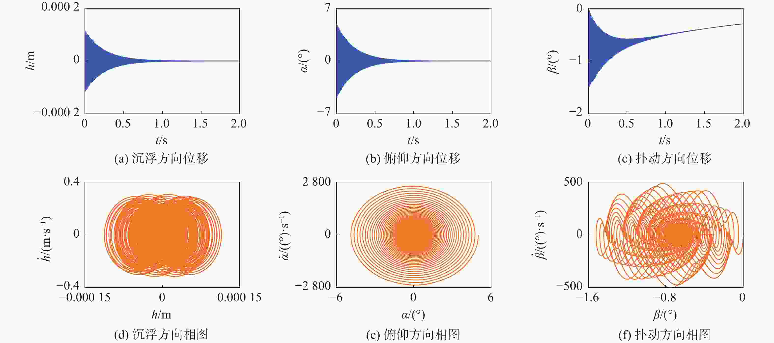 参数 数值 内舵相对坐标原点绕y轴转动惯量Iyyin/(kg·m2) 0.0039 外舵的质量mout/kg 13.60 外舵质心位置的x坐标${\bar x_{{\text{out}}}}$/m 0.0471 外舵质心位置的y坐标${\bar y_{{\text{out}}}}$/m 0.112 外舵相对坐标原点绕x轴转动惯量Ixxout/(kg·m2) 0.2467 外舵相对坐标原点绕y轴转动惯量Iyyout/(kg·m2) 0.2205 外舵相对坐标原点xy惯量积Ixyout/(kg·m2) 0.1154 折叠机构沉浮线弹簧连接刚度Kh/(N·m−1) 1×108 折叠机构俯仰扭簧连接刚度Kα/((N·m)·rad−1) 5×104 折叠机构扑动扭簧连接刚度Kβ/((N·m)·rad−1) 4×104 表 2 折叠舵模态频率的本文方法与Nastran结果