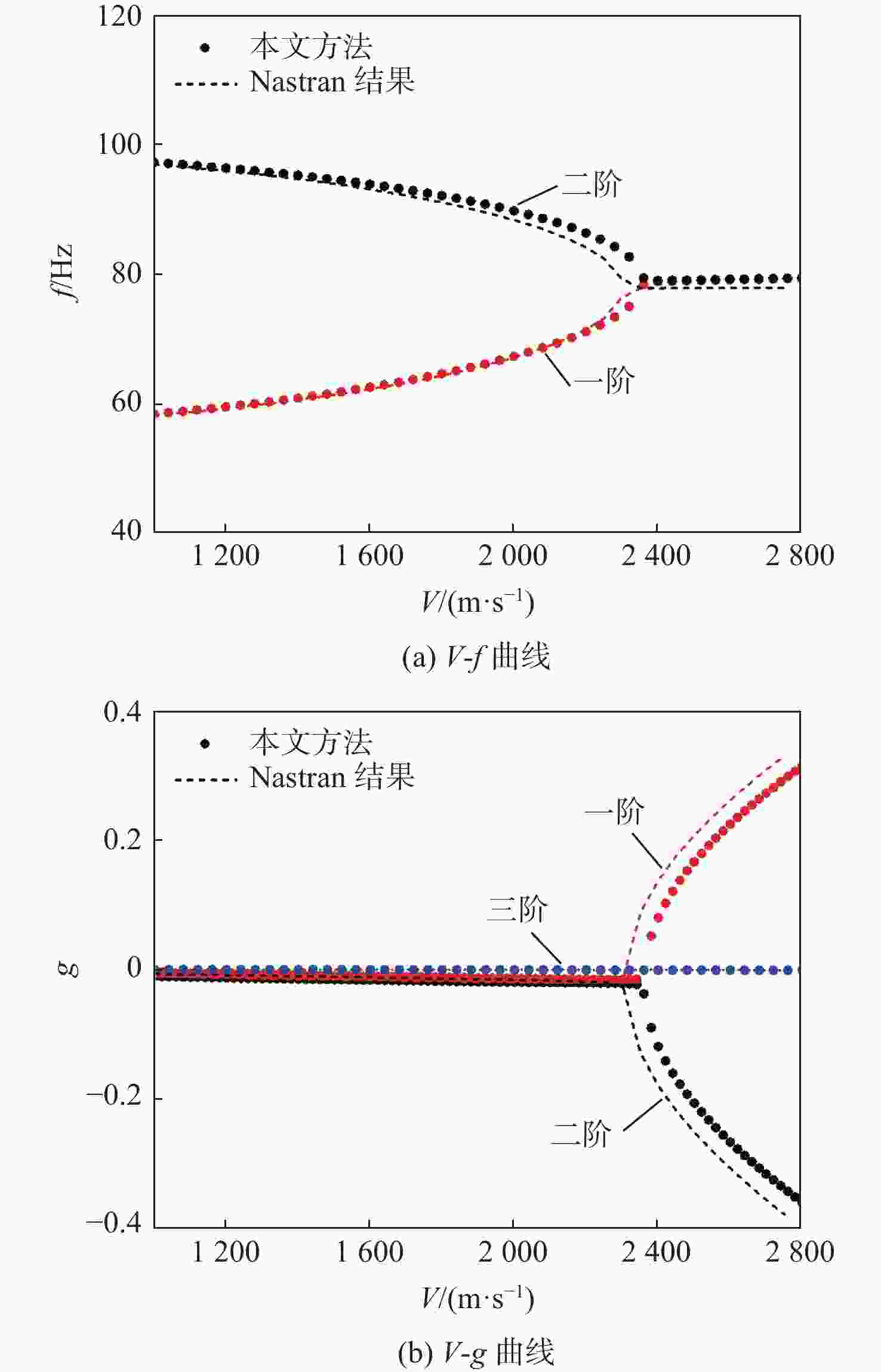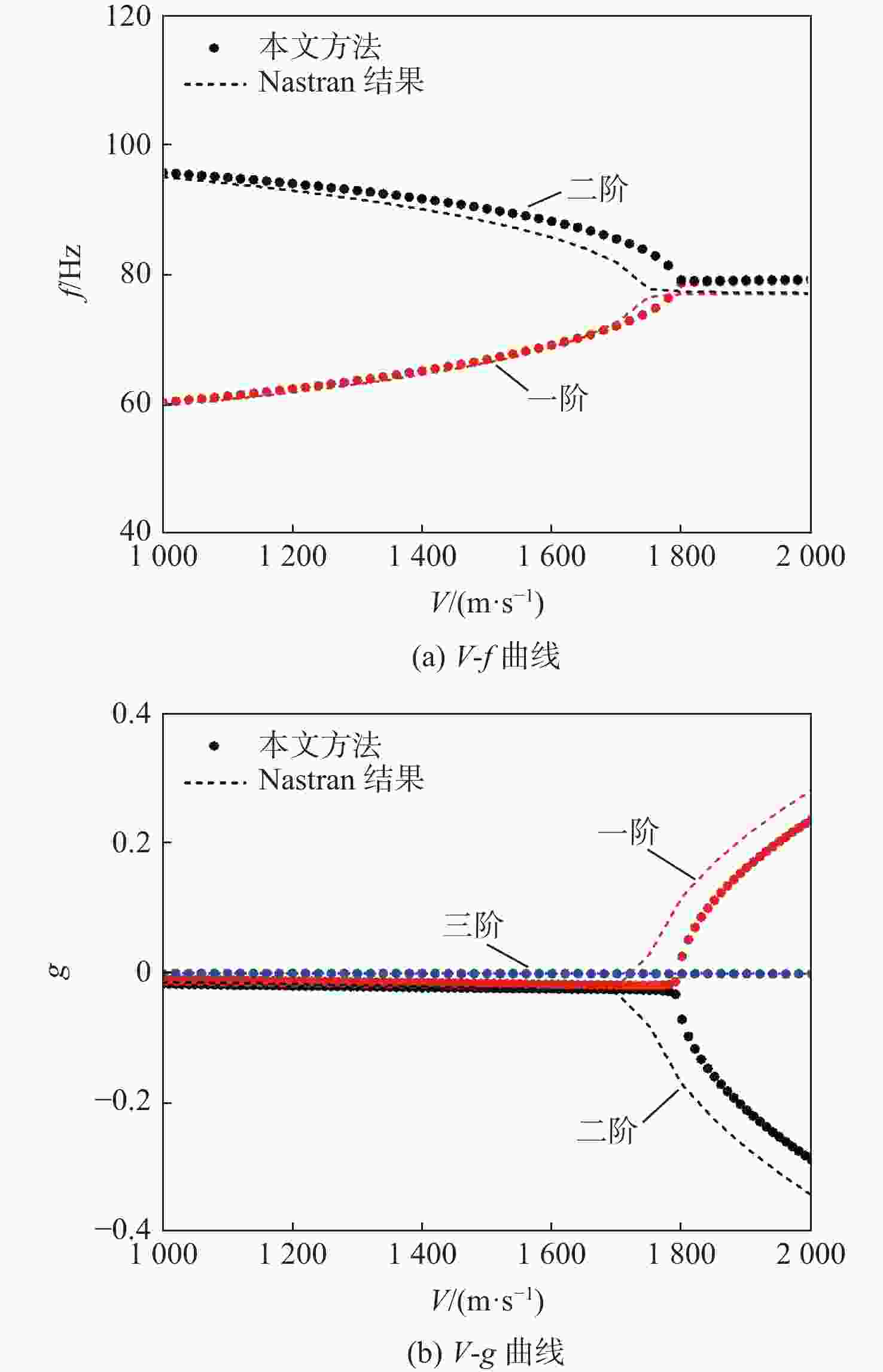 Ma 颤振速度/(m·s−1) 频率误差/% 颤振频率/Hz 频率误差/% 本文方法 Nastran 本文方法 Nastran 3 1795 1720 −4.178 79.34 76.63 −3.416 5 2370 2308 −2.616 78.75 77.84 −1.156 -