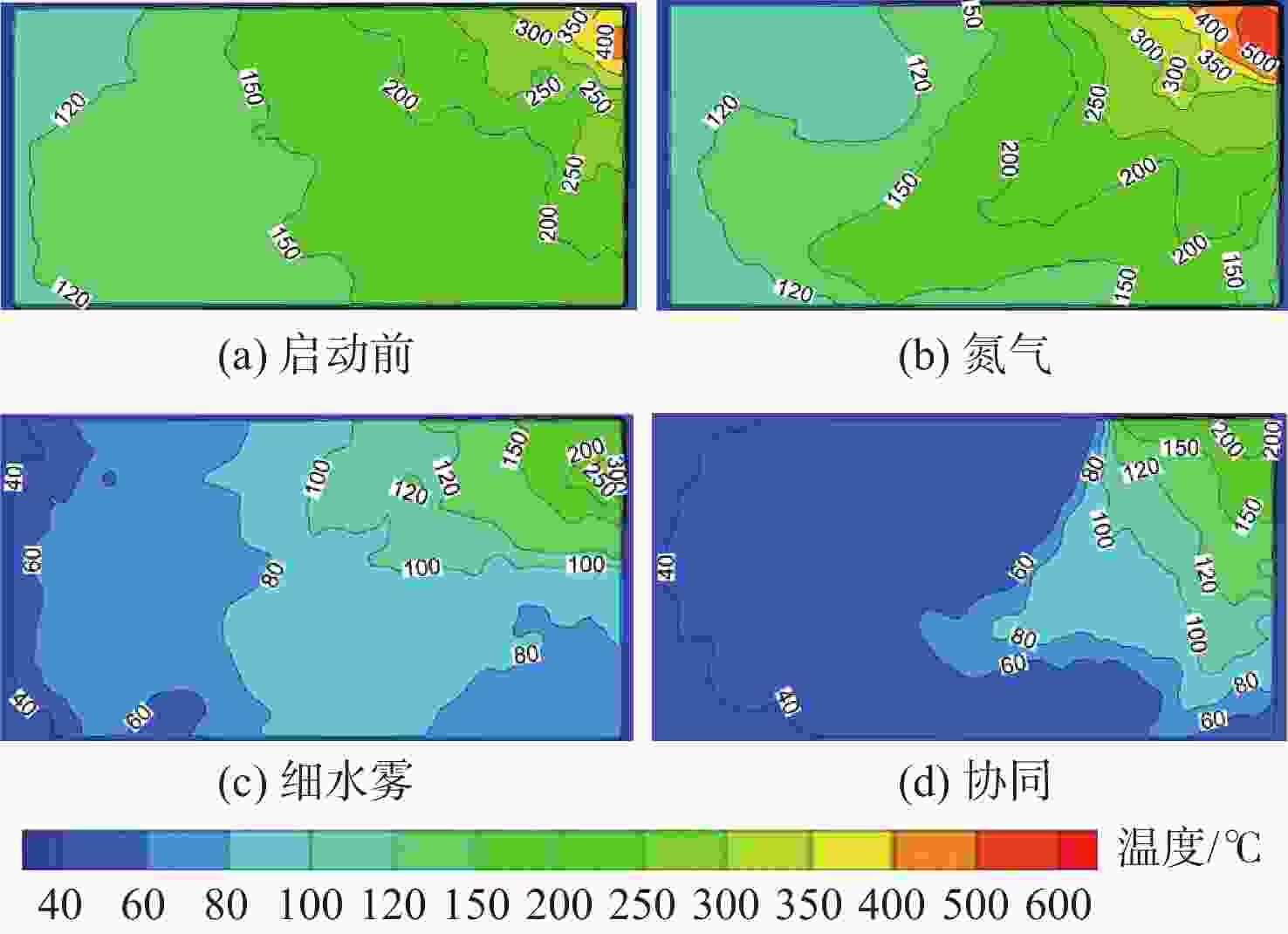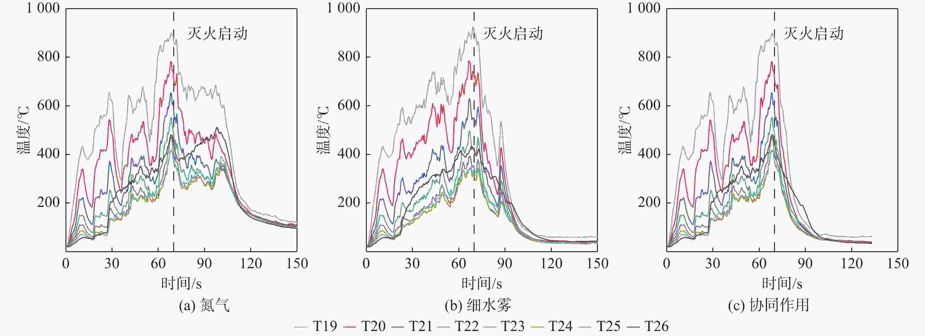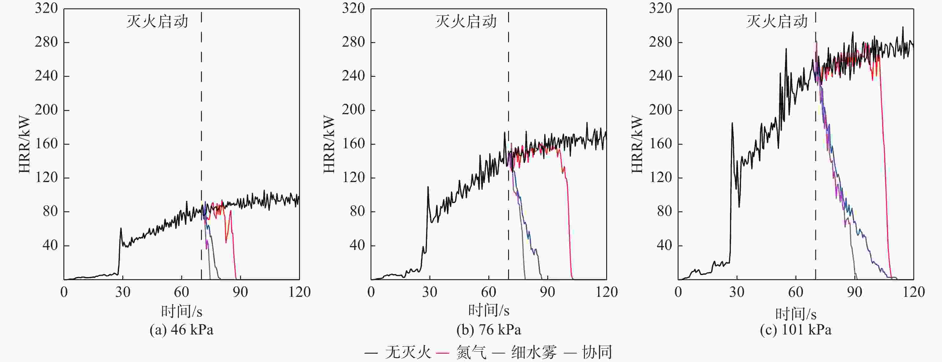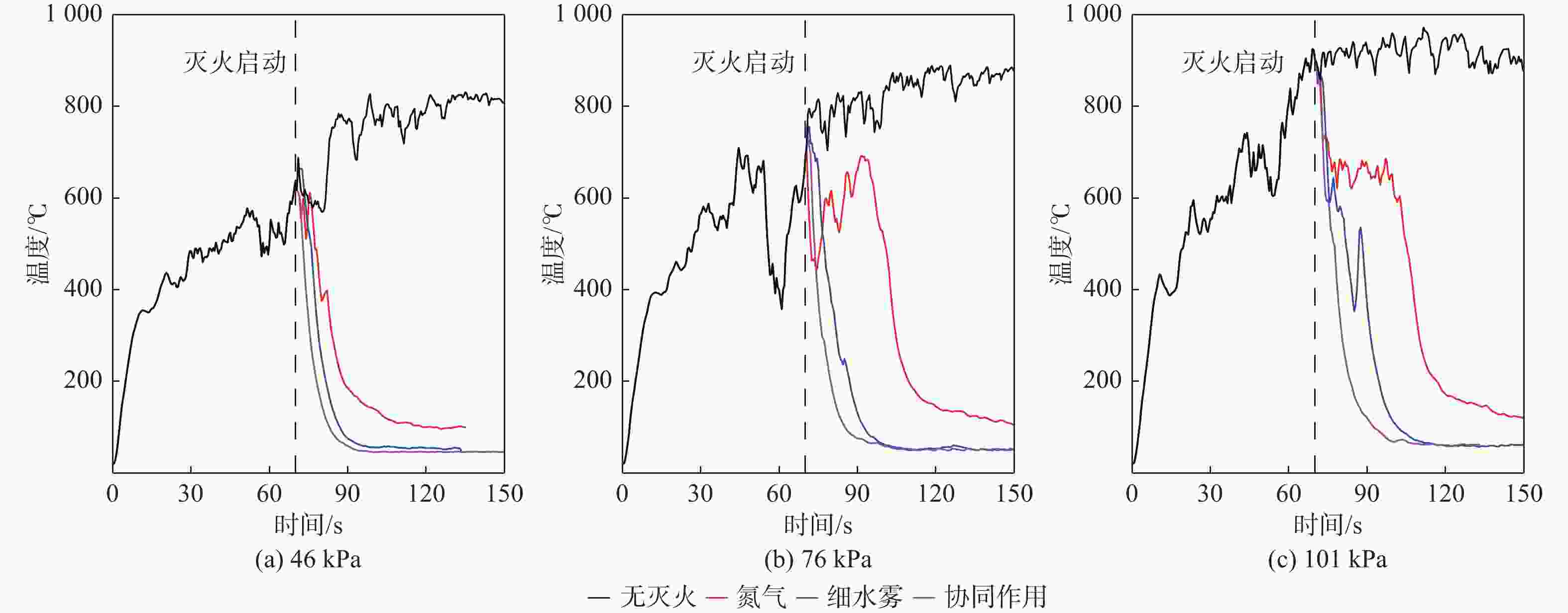 灭火剂 灭火时间/s 46 kPa 76 kPa 101 kPa 氮气 18 33 39 细水雾 10 17 41 协同 5 9 21 表 3 不同环境压力下协同灭火时降温速率数据