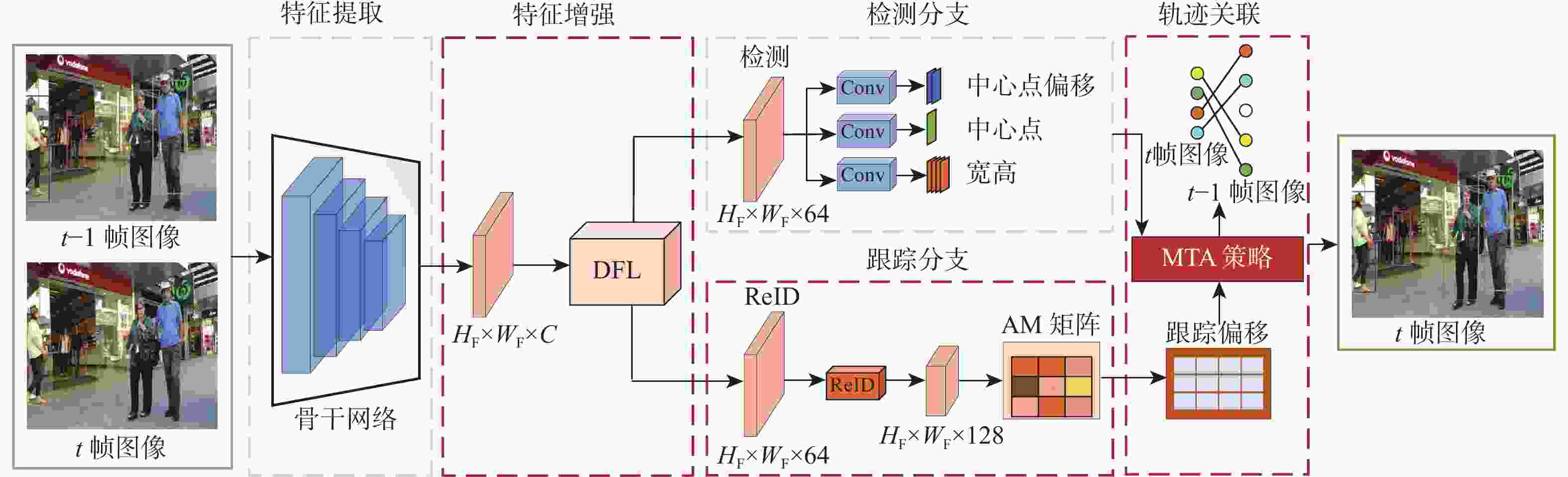 F 1分数(IDF1)值分别达到68.2%和68.5%,与基准算法CenterTrack相比,分别提升了2.1%、4.3%;在MOT20数据集上,MOTA和IDF1值分别达到52.7%和48.2%,分别提升了1.4%、7.9%。所提算法在复杂场景下取得了优异的跟踪性能。Abstract:Insufficient target feature extraction and target occlusion situations frequently occur in single-stage multipal object tracking(MOT) algorithms, resulting in a large number of identity switches and degraded tracking performance. A multi-target tracking algorithm based on dual-branch feature enhancement and multi-level trajectory association(MTA) is proposed to solve this problem. In order to alleviate the excessive competition between detection and tracking branches and fully extract the target improvement features for detection and tracking, respectively, a dual-branch feature learning network is utilized to learn the specificity and relevance of both detection and tracking tasks. An association matrix(AM) is introduced to predict a more accurate offset vector for data association by learning the similarity relationship between two frames. In order to recover lost trajectories and achieve long-term target association, a hierarchical trajectory association strategy is used to divide detection frames into high-score frames and low-score frames, and different matching methods are used to associate with the trajectories. On the typical multi-target tracking datasets MOT17 and MOT20, six related algorithms, including CenterTrack and QuasiDense, are tested. The algorithms’ multipal object tracking accuracy(MOTA)and identity