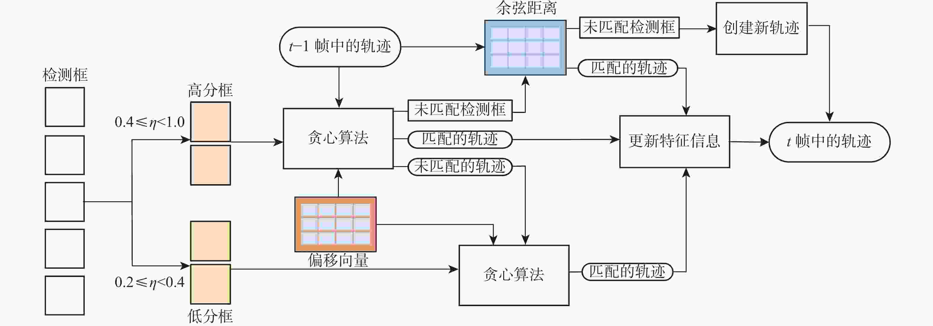 在多目标跟踪(MOT)算法中,经常出现目标特征提取不足、身份切换及轨迹缺失问题,降低跟踪性能。为解决以上问题,提出一种基于双分支特征增强和多级轨迹关联(MTA)的MOT算法。采用双分支特征学习网络对检测和跟踪2种任务的特殊性和相关性进行学习,缓解了两任务之间的过度竞争,提取到充足的目标特征信息;引入关联矩阵(AM),利用更多的时序信息预测偏移向量,减少身份切换次数;采用多级轨迹关联策略,保留一部分低分检测框,并将检测框重新划分为高分框和低分框,采用不同的匹配方式与轨迹进行关联,减少轨迹缺失次数。在典型多目标跟踪数据集MOT17和MOT20上,对JDE、CenterTrack等6种相关算法进行对比实验。实验结果表明:所提算法在MOT17数据集上的多目标跟踪准确度(MOTA)和身份