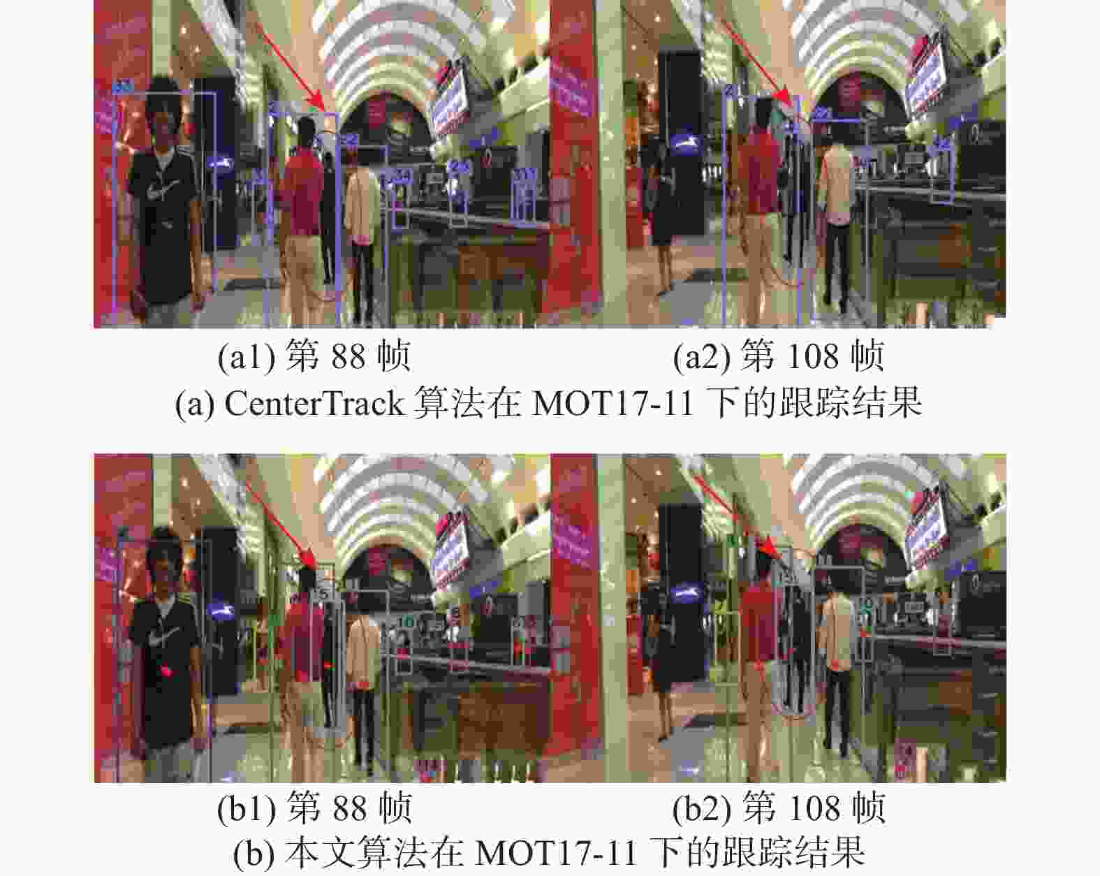 F 1 score (IDF1) values on MOT17 and MOT20 are 68.2% and 68.5%, respectively, 2.1% and 4.3% higher than those of the benchmark algorithm CenterTrack. On MOT20, the MOTA and IDF1 values are 52.7% and 48.2%, respectively, 1.4% and 7.9% higher. The algorithm solves the identity switching problem better and achieves excellent tracking performance in complex scenarios. -