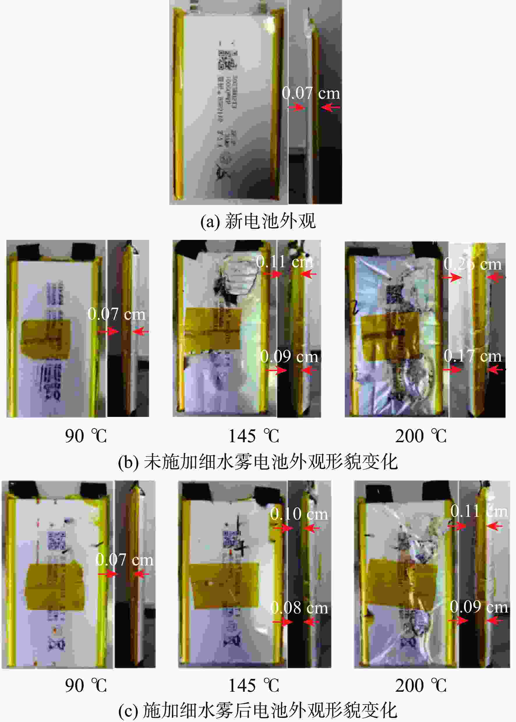 参数 状态/数值 正极材料 NCM523 负极材料 石墨 电池质量/g 151.4±1 额定容量/mAh 10000 标定电压/V 4.2 荷电状态/% 100 电池尺寸/(mm×mm×mm) 7.0×65×115 表 2 不同受热程度有无细水雾电池充放电性能对比