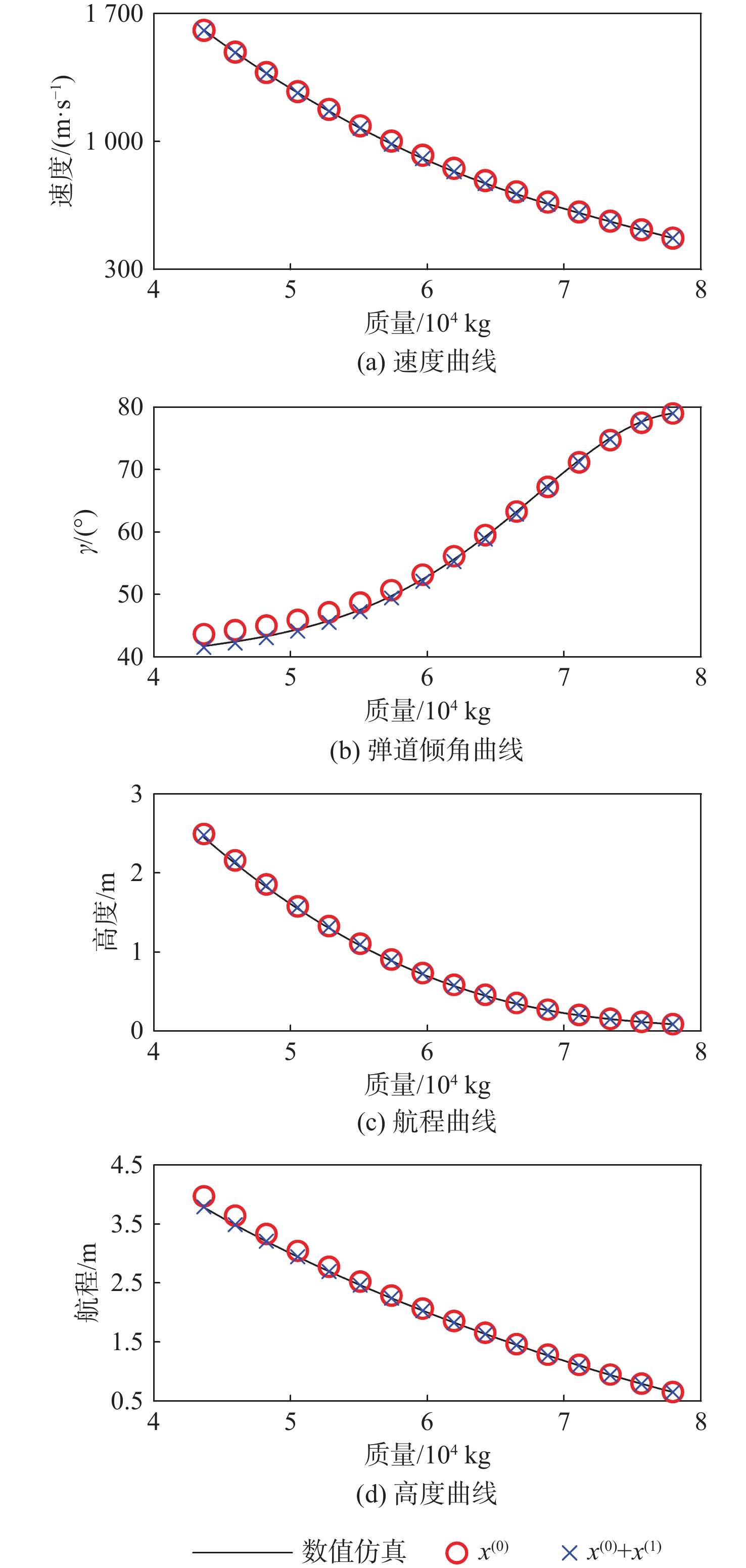 相对误差2/%数值仿真 ${x^{\left( 0 \right)}}$ ${x^{\left( 0 \right)}} + {x^{\left( 1 \right)}}$ 数值仿真 ${x^{\left( 0 \right)}}$ ${x^{\left( 0 \right)}} + {x^{\left( 1 \right)}}$ 1 609.5 1 607.6 1 607.9 −0.120 2 −0.098 9 41.728 4 43.475 6 41.435 4 4.187 0 −0.702 3 航程/km 航程相对