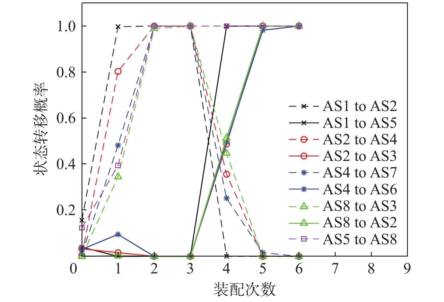 状态 数值 AS1 AS2 AS3 AS4 AS5 AS6 AS7 AS8 AS1 0 $ \dfrac{31}{40} $ 0 0 $ \dfrac{9}{40} $ 0 0 0 AS2 0 0 $ \dfrac{21}{80} $ $ \dfrac{41}{80} $ $ \dfrac{9}{40} $ 0 0 0 AS3 0 0 0 $ \dfrac{11}{40} $ $ \dfrac{7}{20} $ $ \dfrac{3}{16} $ $ \dfrac{1}{10} $ $ \dfrac{7}{80} $ AS4 0 0 $ \dfrac{9}{20} $ 0 $ \dfrac{3}{20} $ $ \dfrac{1}{10} $ $ \dfrac{9}{40} $ $ \dfrac{9}{40} $ AS5 0 $ \dfrac{3}{20} $ $ \dfrac{7}{40} $ $ \dfrac{3}{20} $ 0 $ \dfrac{19}{80} $ $ \dfrac{1}{20} $ $ \dfrac{19}{80} $ AS6 0 0 0 $ \dfrac{2}{55} $ $ \dfrac{1}{55} $ 0 $ \dfrac{34}{55} $ $ \dfrac{18}{55} $ AS7 0 0 $ \dfrac{5}{58} $ 0 $ \dfrac{3}{58} $ $ \dfrac{10}{29} $ 0 $ \dfrac{15}{29} $ AS8 0 $ \dfrac{6}{47} $ $ \dfrac{4}{47} $ $ \dfrac{3}{47} $ 0 $ \dfrac{18}{47} $ $ \dfrac{16}{47} $ 0 表 4 发射矩阵参数