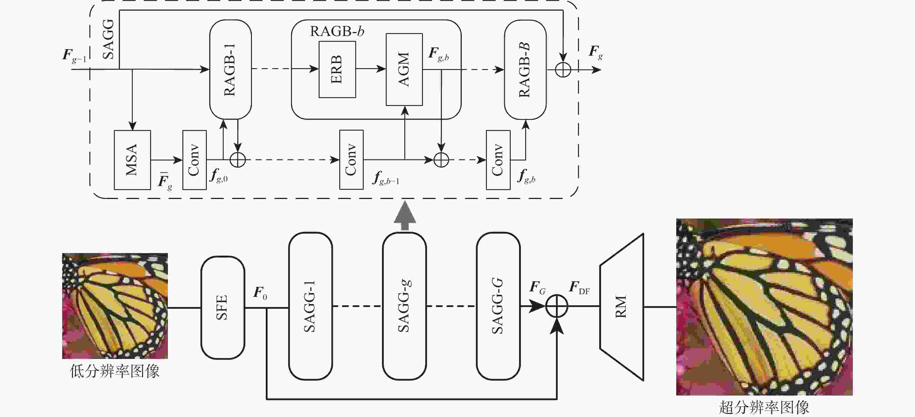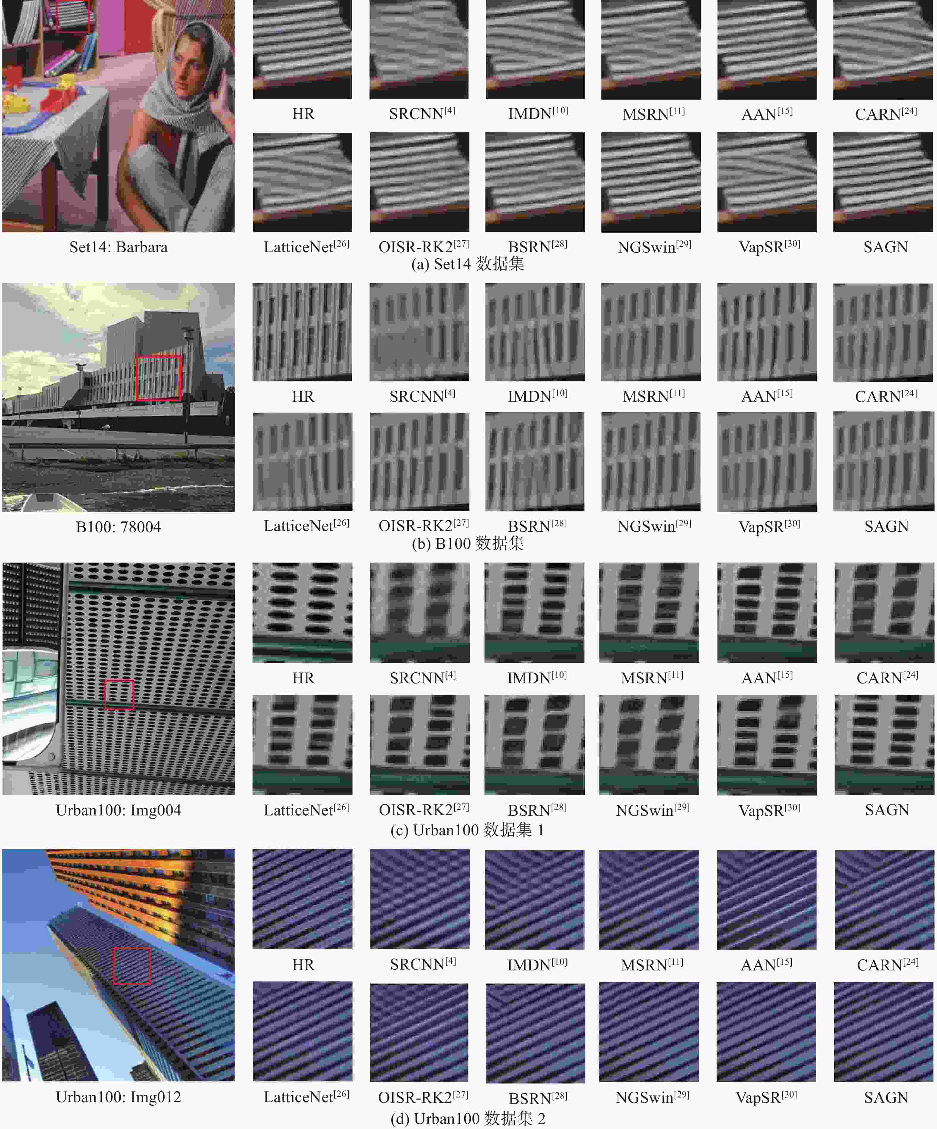 模型 参数量 PSNR/dB SSIM 运行时间/ms EDSR[7] 40.73×106 38.11 0.9602 885 MSRN[11] 5.89×106 38.08 0.9605 685 SwinIR[16] 11.5×106 38.35 0.9620 889 SwinIR-light[16] 0.87×106 38.14 0.9611 355 OISR-RK2[27] 4.97×106 38.12 0.9609 558 BSRN[28] 0.32×106 38.10 0.9610 205 DBPN[31] 5.95×106 38.09 0.9600 775 NGSwin[29] 0.99×106 38.05 0.9610 298 VapSR[30] 0.32×106 38.08 0.9612 223 SAGN 4.15×106 38.18 0.9612 425 注:指标最优和次优分别作加粗和下划线处理。 -