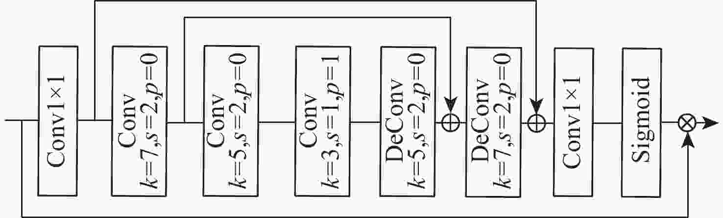 k=5,s=2,p=0$ ({C \mathord{\left/ {\vphantom {C 4}} \right. } 4},{H_1},{W_1}) $ $ \begin{gathered}({C / 8},{H_2} = ({{{H_1} - 5)} / 2} + 1,\\ {W_2} = ({{{W_1} - 5)} / 2} + 1) \end{gathered} $ Conv