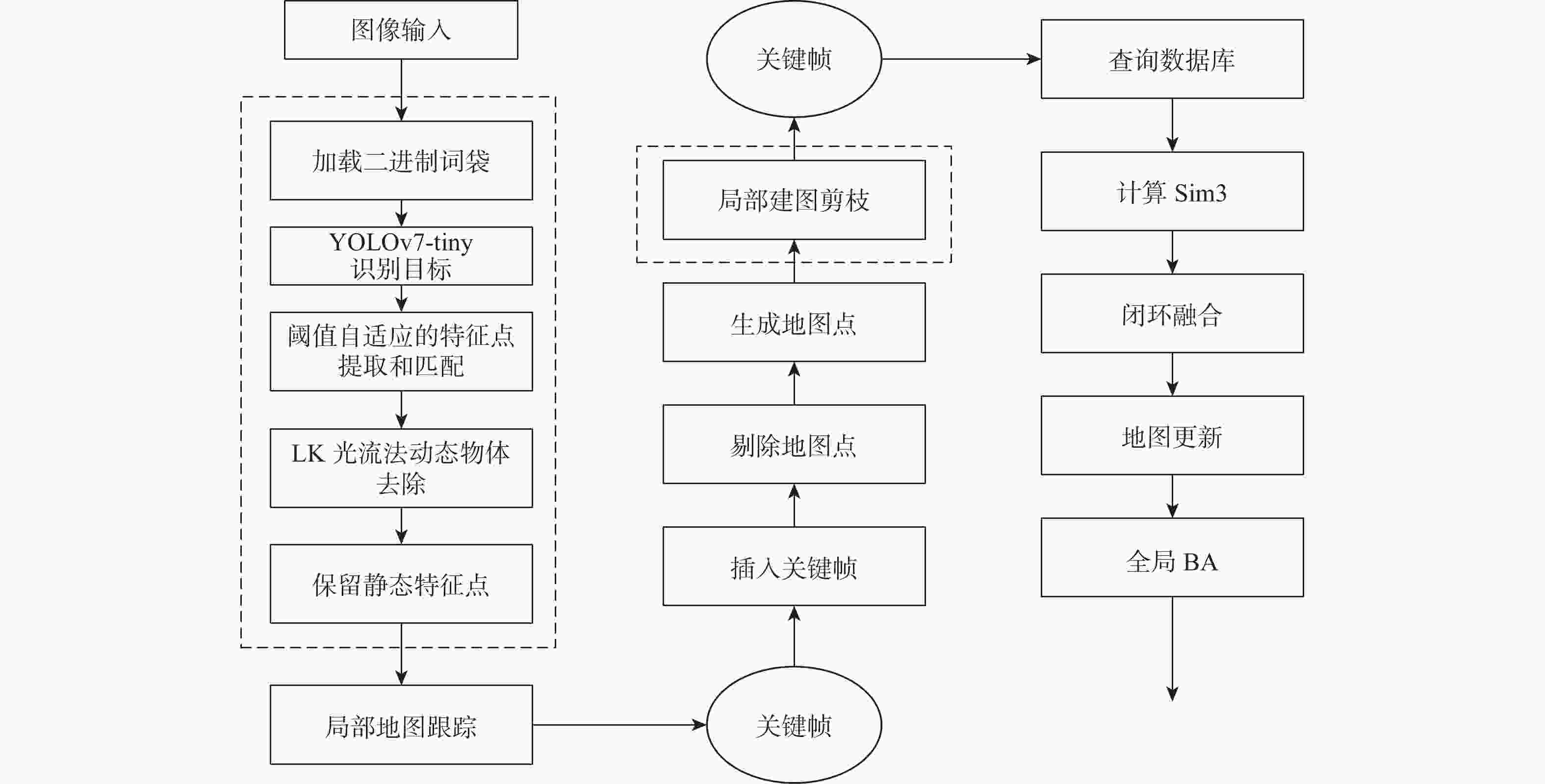 视觉同步定位与地图构建(VSLAM)是一种利用视觉等传感器来获取未知环境信息的技术,广泛应用于无人驾驶、机器人、增强现实等领域。然而,室内场景下的VSLAM对动态对象进行像素级的语义分割存在较高的计算开销,并且光照变化使得动态物体的外观也发生变化,导致其与静态环境产生遮挡或混淆。针对以上问题,提出了一种基于自适应阈值和速度优化的轻量化语义VSLAM模型。采用了轻量化的一阶段目标检测网络YOLOv7-tiny,结合光流算法,有效地检测了图像的动态区域,并对不稳定特征点进行了剔除。同时,特征点提取算法基于输入图像的对比度信息,自适应地调整阈值。结合二进制词袋与局部建图线程精简的优化方法,加快了加载和匹配速度,提高了系统在室内动态场景下的运行速度。实验结果表明:所提算法在室内高动态场景下能够有效地剔除动态特征点,提高了相机的定位精度。在运行速率方面平均处理速度达到了19.8 FPS,在实际场景下可以满足实时性的需求。