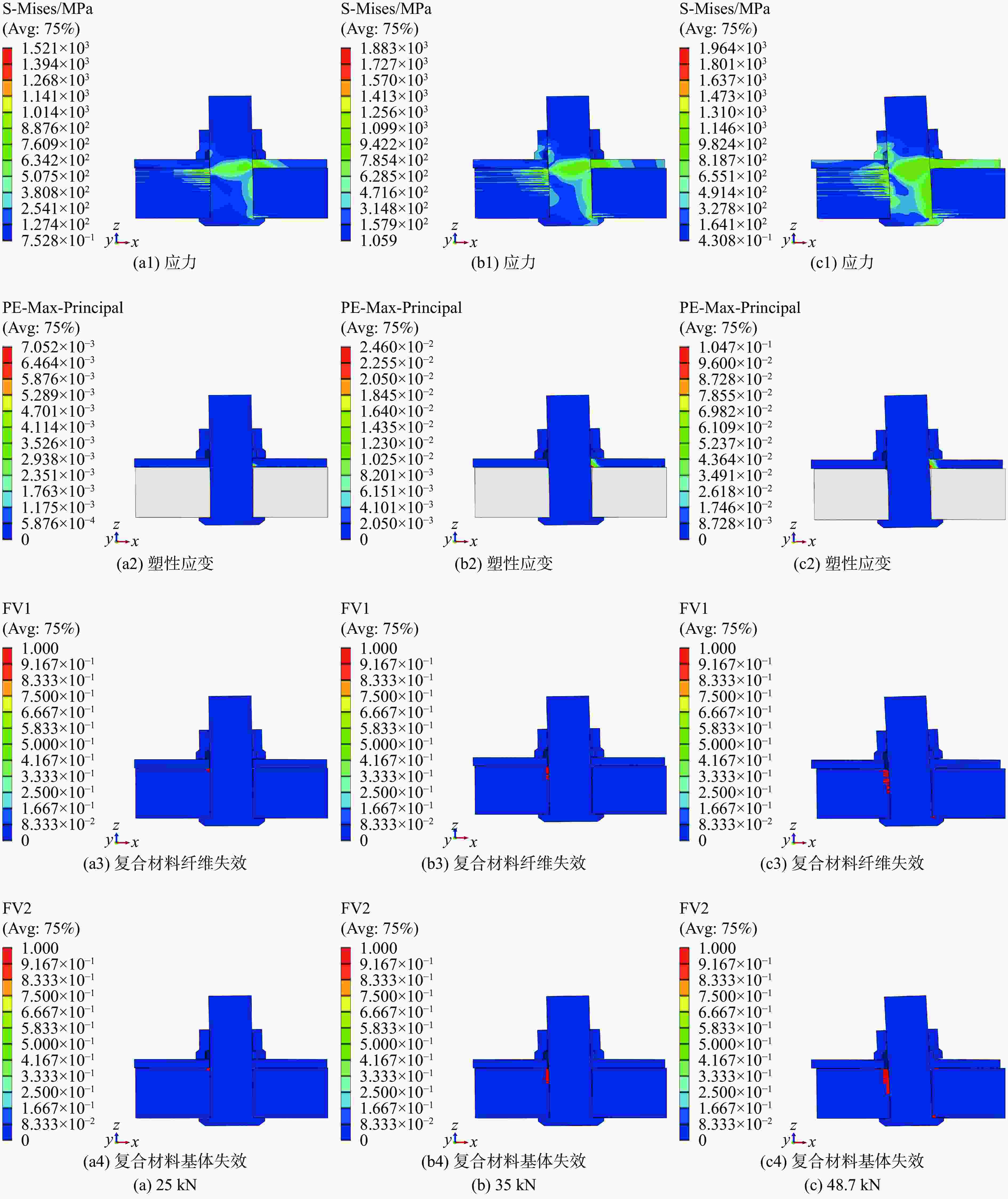 失效模式 退化方案 E11 E22 E33 G12 G13 G23 ν12 ν13 ν23 完好 1 1 1 1 1 1 1 1 1 纤维失效 0.01 1 1 0.01 0.01 1 0.01 0.01 1 基体失效 1 0.01 0.01 0.01 0.01 0.01 0.01 0.01 0.01 纤维失效+基体失效 0.01 0.01 0.01 0.01 0.01 0.01 0.01 0.01 0.01 -