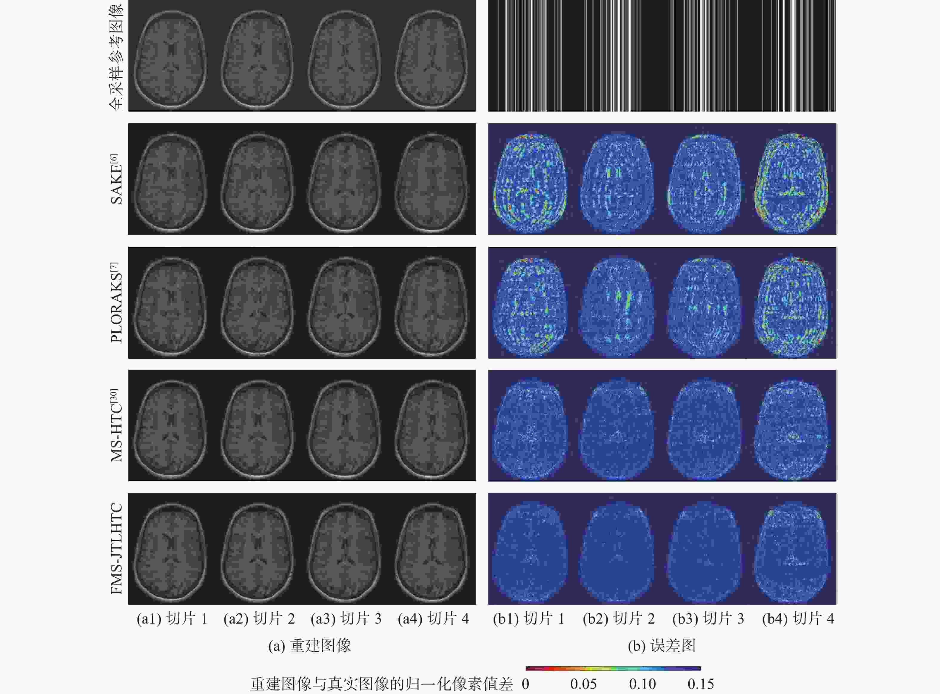 算法 AF PSNR /dB MSSIM FSIM HFEN SAKE[6] 3 37.89 0.9571 0.9996 0.0664 5 35.36 0.9326 0.9990 0.0980 8 33.48 0.9148 0.9984 0.1361 10 32.67 0.9068 0.9979 0.1609 12 32.09 0.8977 0.9974 0.1797 PLORAKS[7] 3 37.86 0.9537 0.9996 0.0657 5 35.55 0.9354 0.9991 0.0966 8 33.65 0.9168 0.9984 0.1354 10 32.83 0.9059 0.9979 0.1549 12 32.24 0.8987 0.9975 0.1730 MS-HTC[30] 3 38.55 0.9626 0.9997 0.0591 5 35.98 0.9435 0.9992 0.0850 8 34.21 0.9263 0.9987 0.1144 10 33.26 0.9136 0.9981 0.1343 12 32.92 0.9115 0.9979 0.1458 FMS-JTLHTC 3 39.99 0.9738 0.9997 0.0529 5 37.58 0.9619 0.9995 0.0722 8 35.76 0.9497 0.9992 0.0951 10 34.94 0.9435 0.9989 0.1094 12 34.34 0.9383 0.9988 0.1203 表 3 4种算法对AF=3的1D-Possion欠采样模式下数据集dataset 1重建的评价指标值