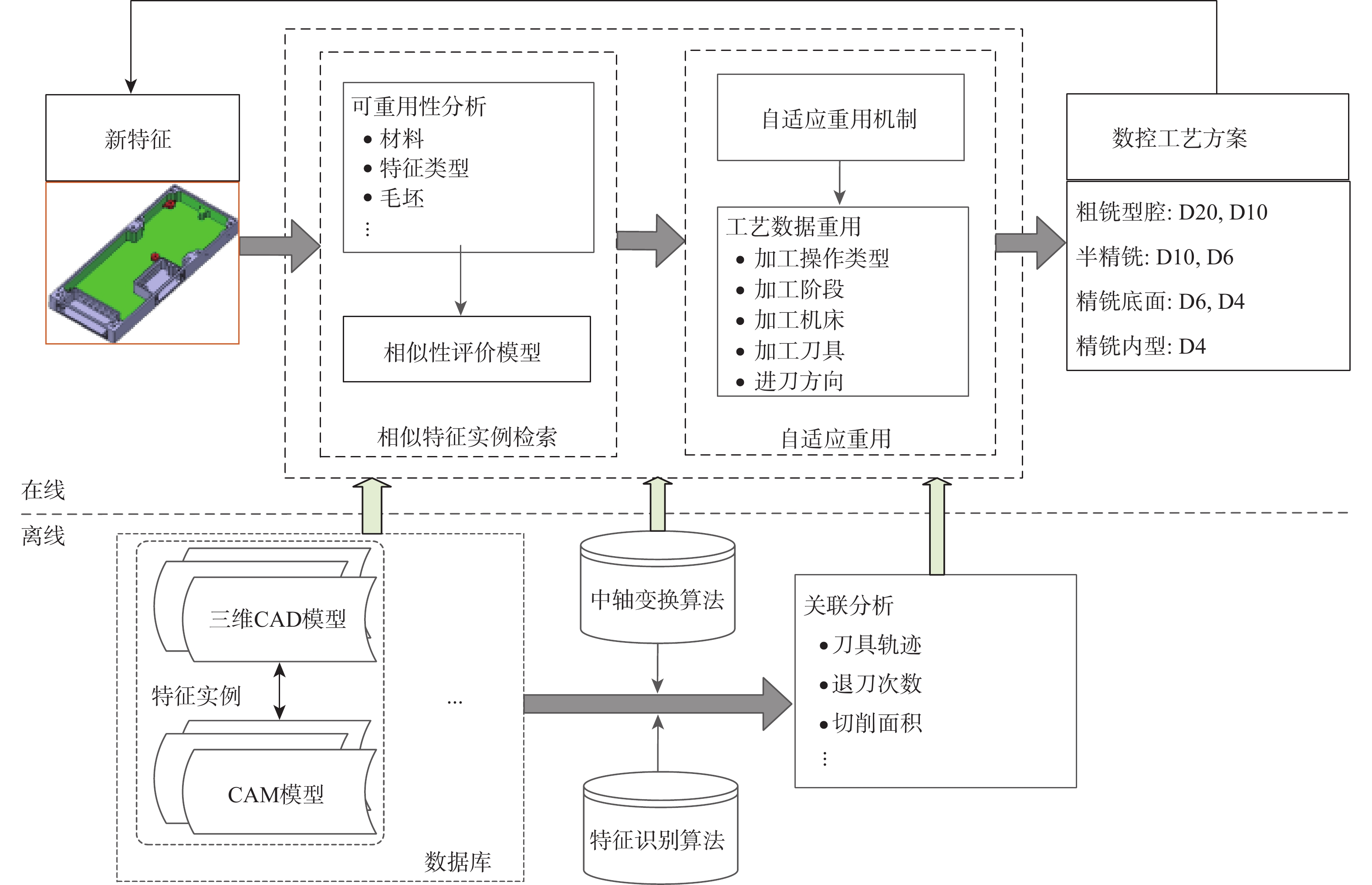 为实现对已有数控(NC)工艺设计成果的有效重用,提出一种计算机辅助设计/计算机辅助制造(CAD/CAM)模型驱动的型腔特征自适应数控工艺设计方法。基于中轴变换(MAT)提取型腔特征三维CAD模型中隐藏的高层次数控工艺信息,有效表征刀具切削过程;针对已有特征实例进行可重用性分析,构建一个融合多属性数控工艺要素的特征相似性评价模型;基于检索返回的相似特征实例,自适应重用其关联的CAM模型工艺参数生成新特征的数控工艺。实验结果表明:所提方法能够自动、高效地获得特征数控工艺,提升工艺设计效率85%以上,满足企业工艺设计智能化的工程需求。