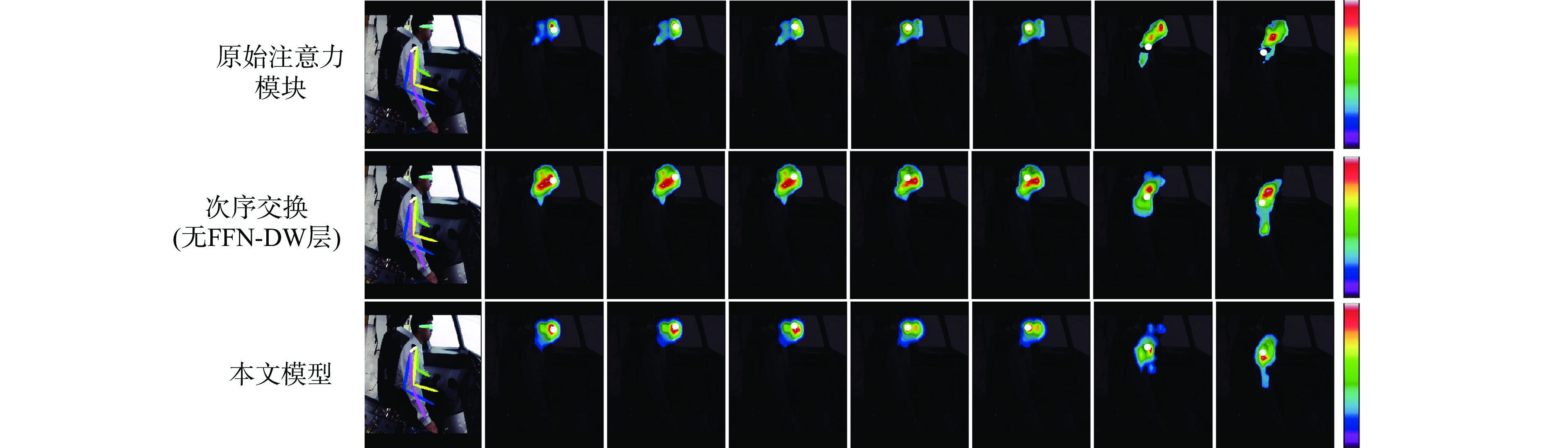 尺寸 阶段1 阶段2 阶段3 阶段4 64 × 48 $ \left[\begin{array}{l}1\times 1,64\\ 3\times 3,64\\ 1\times 1,256\end{array}\right] $×2 $ \left[\begin{array}{l}次序交换注意力模块,\text{32}\\ 头\text{=1},深度线性模块=\text{7}\times \text{7}\end{array}\right] $×2 $ \left[\begin{array}{l}次序交换注意力模块,\text{32}\\ 头\text{=1},深度线性模块=\text{7}\times \text{7}\end{array}\right] $×2 $ \left[\begin{array}{l}次序交换注意力模块,\text{32}\\ 头\text{=1},深度线性模块=\text{7}\times \text{7}\end{array}\right] $×2 32 × 24 $ \left[\begin{array}{l}次序交换注意力模块,64\\ 头\text{=1},深度线性模块=\text{7}\times \text{7}\end{array}\right] $×2 $ \left[\begin{array}{l}次序交换注意力模块,64\\ 头\text{=1},深度线性模块=\text{7}\times \text{7}\end{array}\right] $×2 $ \left[\begin{array}{l}次序交换注意力模块,64\\ 头\text{=1},深度线性模块=\text{7}\times \text{7}\end{array}\right] $×2 16 × 12 $ \left[\begin{array}{l}次序交换注意力模块,\text{128}\\ 头\text{=2},深度线性模块=\text{5}\times \text{5}\end{array}\right] $×2 $ \left[\begin{array}{l}次序交换注意力模块,\text{128}\\ 头\text{=2},深度线性模块=\text{5}\times \text{5}\end{array}\right] $×2 8 × 6 $ \left[\begin{array}{l}原始注意力模块,\text{256} \\ 头\text{=4}\end{array}\right] $×2 表 2 不同模型在飞行员肢体关键点检测数据集上的性能比较