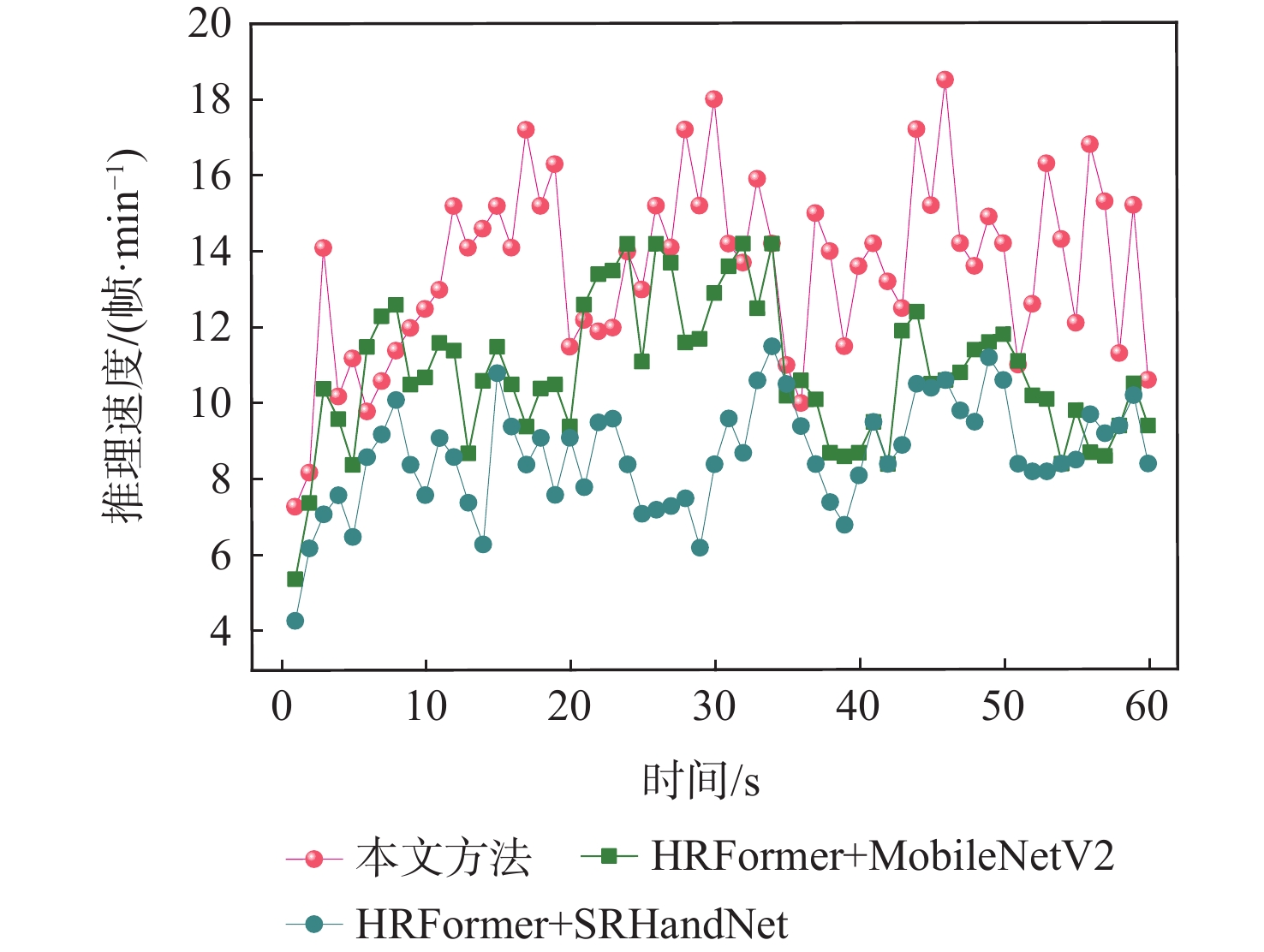 模型 主干网络 输入尺寸/(像素×像素) 参数量 浮点运算速度/(109 s−1) AP/% AR/% SimpleBaseline[34] ResNet-50 256×192 34.0×106 8.9 77.9 78.5 HRNet[20] HRNet-W32 256×192 28.5×106 7.1 80.8 81.6 TransPose[24] HRNet-W32 256×192 8.0×106 10.2 81.3 83.2 PoseUR[35] HRFormer-B 256×192 28.8×106 12.6 82.1 83.8 HRFormer[22] HRFormer-S 256×192 2.5×106 1.3 80.6 82.2 本文 HRNet-Former 256×192 4.5×106 3.8 81.9 83.3 表 3 不同模型推理速度比较