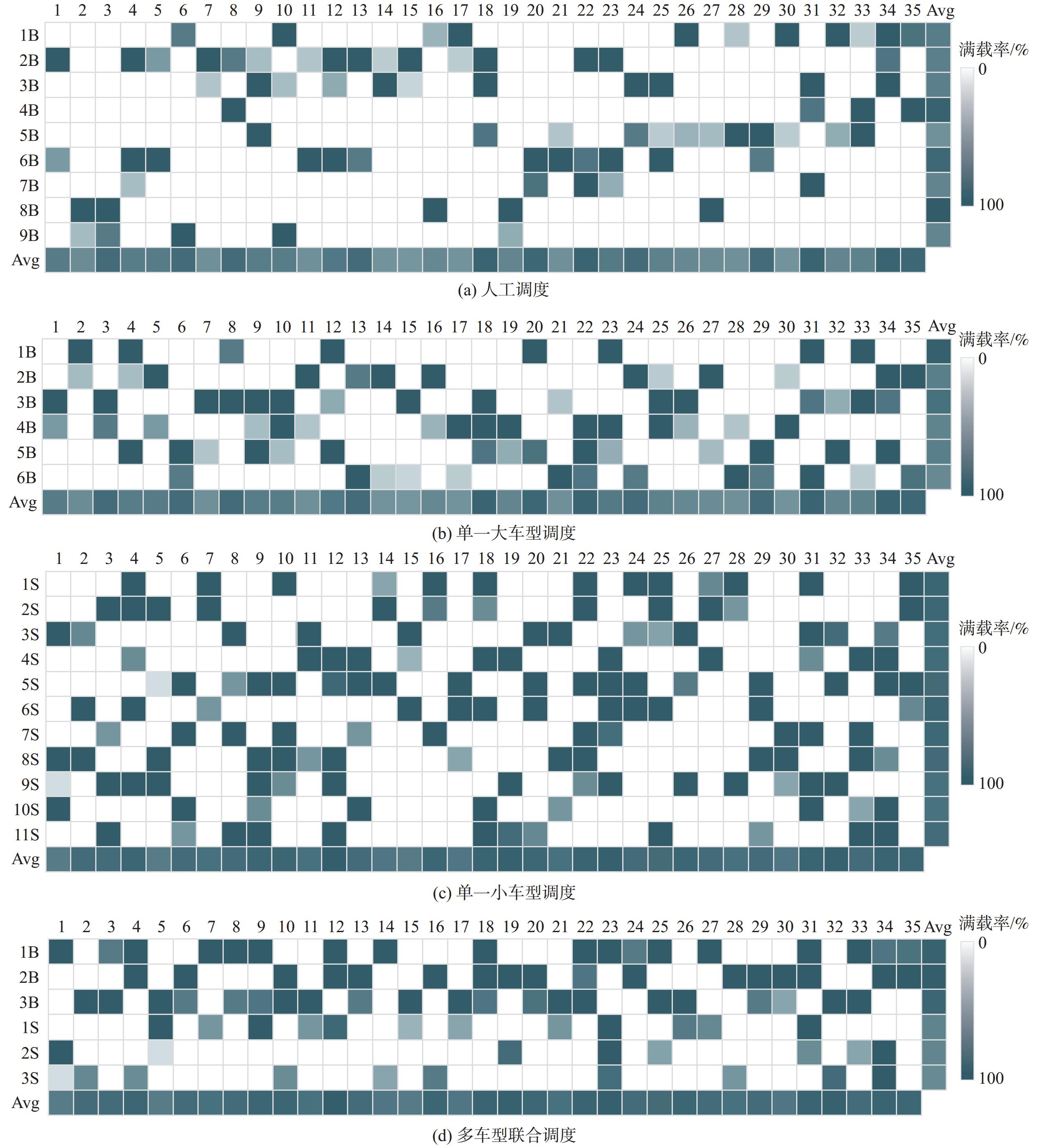 (人·单位容量−1)大车 小车 总体 人工调度 82.05 7.17 7.17 单一大车型调度 82.05 10.83 10.83 单一小车型调度 90.78 11.64 11.64 多车型联合调度 90.78 18.33 10.33 14.22 -