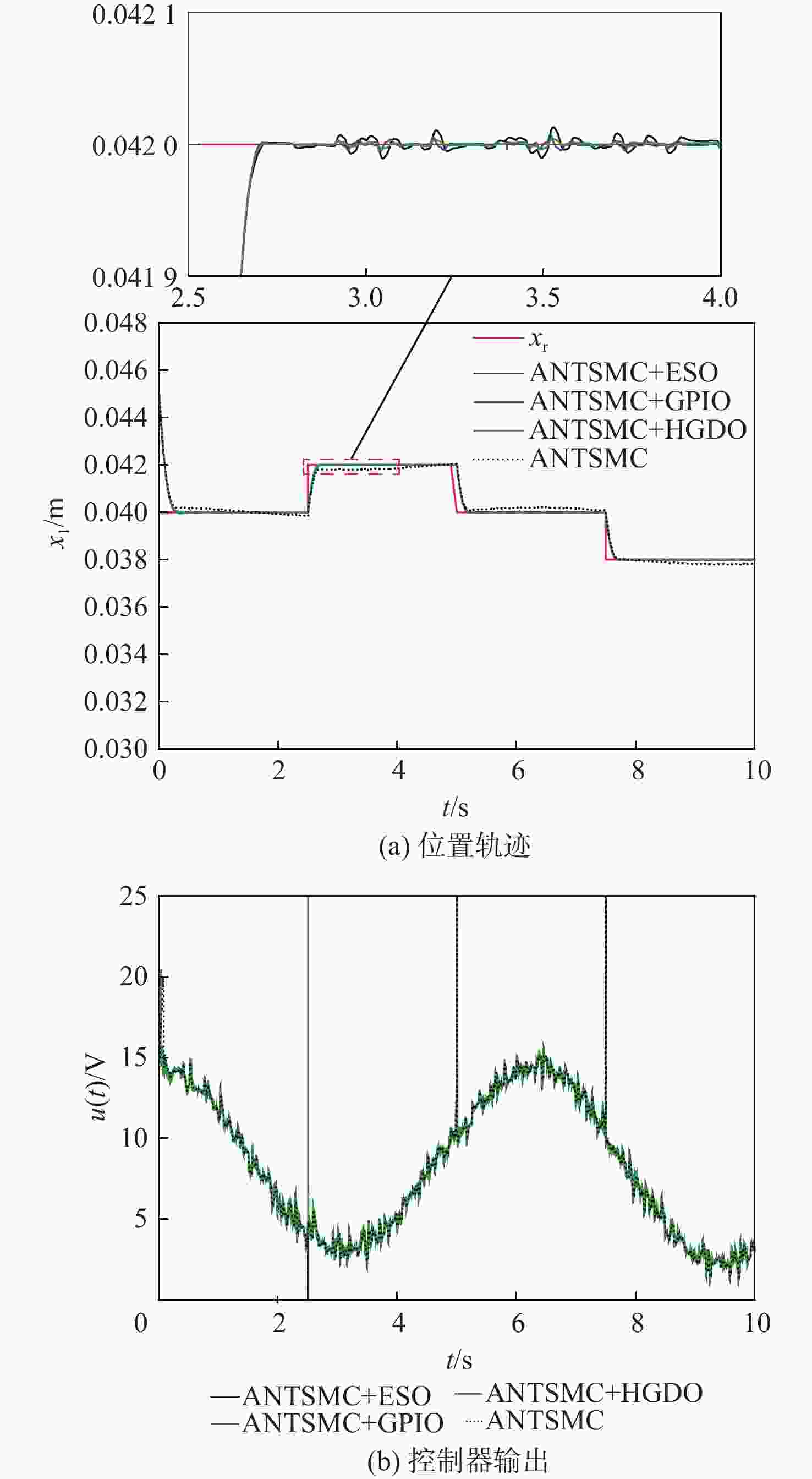 参数 数值 质量$m{\mathrm{/kg}}$ 0.17 线圈电阻${R \mathord{\left/ {\vphantom {R \Omega }} \right. } \Omega }$ 13.577 线圈匝数${N / {\mathrm{T}}}$ 1057 真空磁导率$ \mu/({\mathrm{H}} \cdot {{\mathrm{m}}^{ - 1}}) $ $4 {\text{π}} \times {10^{ - 7}}$ 磁导截面积${S / {{{\mathrm{m}}^2}}}$ $9 {\text{π}} \times {10^{ - 4}}$ 平衡位置${{{x_{\rm{r}}}}/{\mathrm{m}}}$ 0.04 平衡位置电流${{{i_0}} /{\mathrm{A}}}$ 0.633 表 2 控制器仿真参数