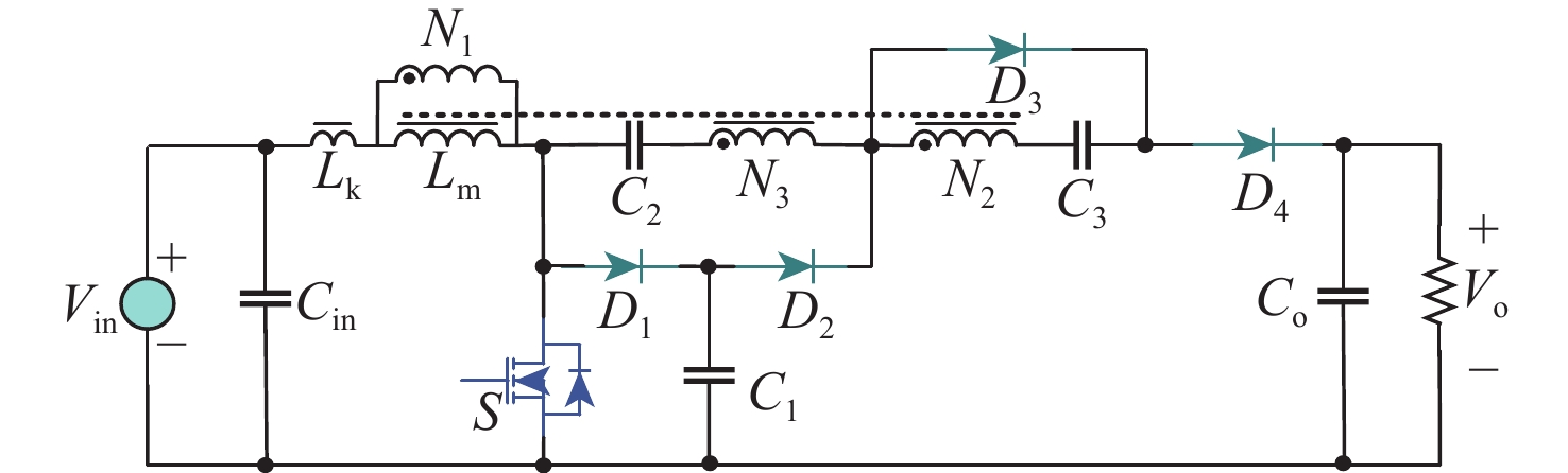 参数 值 输入电压Vin/V 20 漏感Lk/μH 1 励磁电感Lm/μH 18.75 L2自感/μH 168.75 L3自感/μH 300 匝比N2:N1 3 匝比N3:N1 4 箝位电容C1/μF 150 电荷泵电容C2/μF 22 倍压电容C3/μF 47 工作频率f/kHz 100 负载电阻R/Ω 2200 表 2 本文三绕组耦合电感变换器实际样机器件参数
