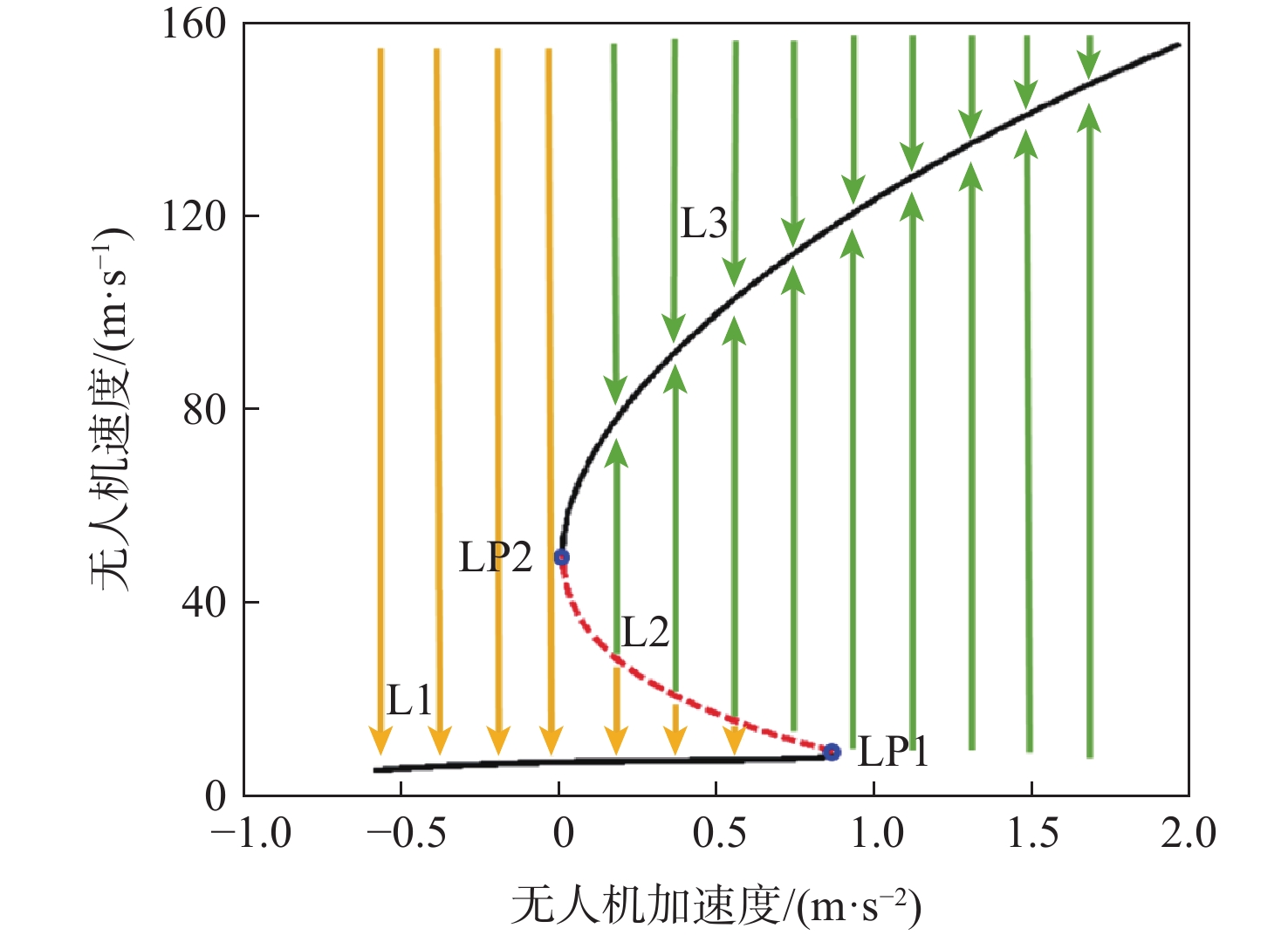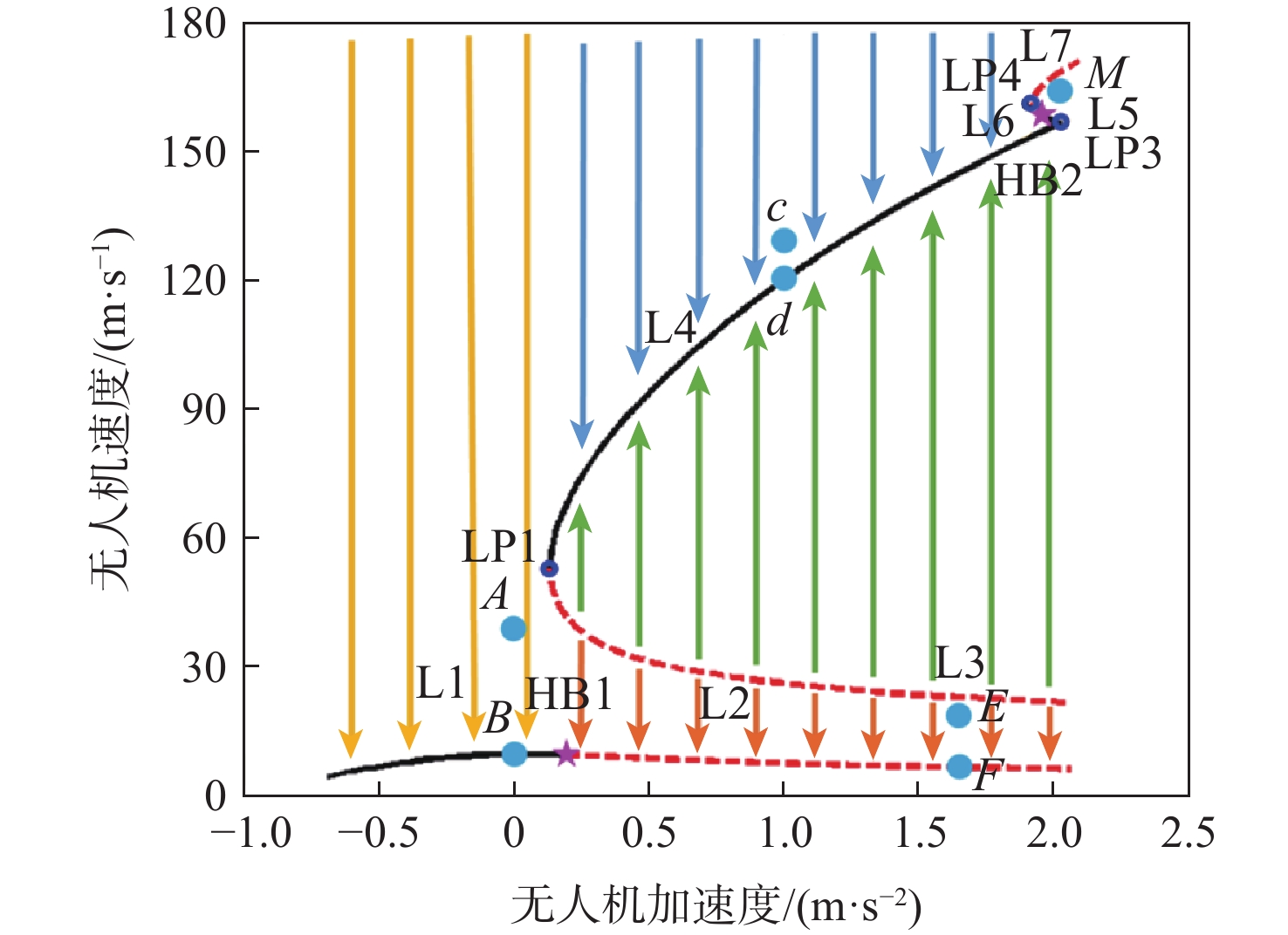 High-speed UAV is prone to spin out of control, veer off the runway, and other major incidents because of the influence of numerous nonlinear elements such tire forces, aerodynamic forces, and rudder surface forces during the ground taxiing process. At present, the bifurcation is used to analyze the stability of aircraft ground taxiing nonlinear turning system, which is based on the equilibrium system of constant speed taxiing system. And it is impossible to analyze the influence of acceleration and deceleration on the stability of nonlinear non-autonomous aircraft ground taxiing systems by this theory. Thus, the D’Alembert principle is used to transform the nonlinear dynamic system into an equivalent nonlinear equilibrium system to study the bifurcation characteristics. To convert the system into an analogous equilibrium system, inertia force is incorporated into the system model based on the D’Alembert principle, and the nonlinear ground variable speed taxiing dynamics model of the UAV is built in MATLAB/Simulink. Then the global stability and bifurcation characteristics of the system are solved by the numerical continuation method, and the effect of acceleration on the stability of the turning direction is analyzed, and the saddle-node bifurcation and Hopf bifurcation in the system are analyzed. The motion states and forces of the UAV under three typical operating conditions are also analyzed, and the nature and mechanism of the directional instability of the UAV during the turning of ground variable speed sliding are revealed. Finally, based on the single-parameter bifurcation analysis of acceleration, the front wheel steering angle is introduced as an additional parameter into the UAV ground taxiing dynamic model by using the open folding method, and the dual-parameter bifurcation analysis is carried out to discuss the influence of two parameters on the stability of ground taxiing direction. And the phenomena of BT bifurcation, GH bifurcation, and ZH bifurcation on the stability of the ground taxiing direction of UAV is discussed.
