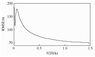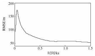 飞机和目标的轨迹如图 3所示.在图中,每隔250s标注出3架飞机的位置,并将此时的目标与己方飞机用虚线连接起来,可以看出,飞机1一直靠近目标,由于飞机2与目标的初始距离小于最小距离,所以飞机2开始时的轨迹是远离目标的,之后将靠近目标,两架飞机与目标的视线之间的夹角也在π/2左右,直到达到最优几何配置.飞机与目标的视线夹角如图 4所示,两架飞机与目标的视线之间的夹角最终在π/2附近波动,且波动很小.双机协同无源跟踪目标的PDOP变化曲线如图 5所示,可以看出目标的PDOP减少并收敛于最小的PDOP.这说明基于RHO的双机轨迹优化设计能够使得飞机按双机协同无源跟踪的最优几何配置飞行.目标的位置估计均方根误差(RMSE)曲线如图 6所示,目标的均方根误差减少并收敛到一个较小水平.这说明基于RHO的双机轨迹优化设计能够减少估计误差,提高目标的估计精度.此情形下,该轨迹优化算法总耗时为139s,比仿真时间1500s的1/10还小,这说明该算法具有一定的实时性.