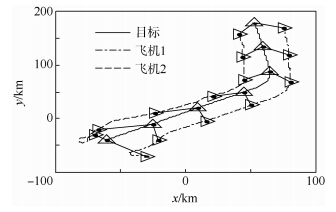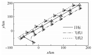 | 图 7 情形2的飞机及目标轨迹 Fig. 7 Aircraft and target trajectory of case 2 |