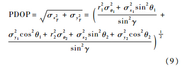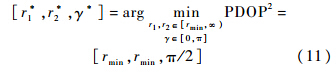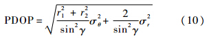 对于双机协同探测跟踪系统,位置精度因子(PDOP)是一种常见的衡量探测精度的指标[1, 2, 3, 4, 15],在本文中,PDOP可表示为