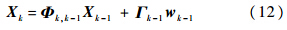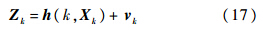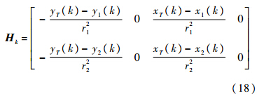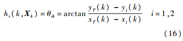 2k]T为k时刻的双机协同观测向量值;h(k,Xk)=[h1(k,Xk),h2(k,Xk)]T为k时刻的双机协同观测函数,这是一个非线性函数,对其进行线性化处理,得其Jacobian矩阵: