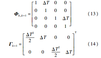 系统的状态向量为X=[xT,x·T,yT,y·T]T.其中,(xT,yT)为目标的位置,(x·T,y·T)为目标的速度.则目标的运动模型为