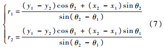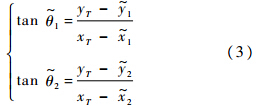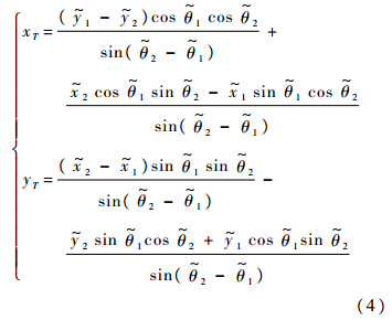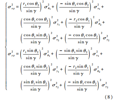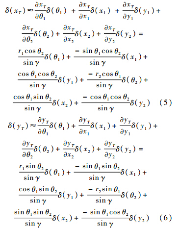 根据泰勒公式,可将xT,yT在真实值(θ1,θ2,x1,x2,y1,y2)处进行展开,并只保留一阶项,得到目标x方向和y方向估计误差:
