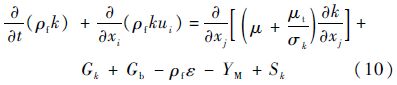 式中:ui为第i相流体的速度;Gk为由层流速度梯度而产生的湍流动能;Gb为由浮力产生的湍流动能;YM为由于在可压缩流中,过渡的扩散产生的波动;C1ε、C2ε和C3ε为常数;σk和σε为k方程和ε的湍流Prandtl数;Sk和Sε为用户定义的源项[13].