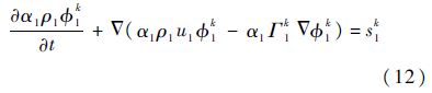式中:α1、ρ1和u1分别为phase-l的体积分数、密度及速度;Γ1k和s1k分别为扩散系数与源项.在这种情况下,标量φ1k只与某一相相关联(phase-l),且为一个独立的变量.