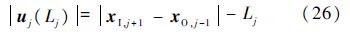 2) |uj(Lj)|>δ.此时该段系绳发生较大的变形,无法用杆近似,惯量参数也有较大的变化,可以认为系绳断为两截,应分段采用前文建立的单链式递推算法,体j-1成为链1~j-1的端体,j+1则成为链j+1~n+2的根体.另外时时计算uj(Lj)的值,若减小至δ以下,则切换回单链递推算法.uj(Lj)可由以下公式计算: