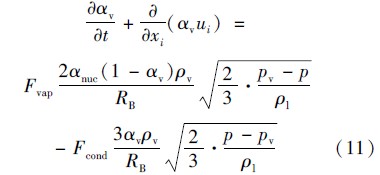 在对空化问题进行求解时,本文应用了基于Rayleigh-Plesset气泡方程建立的Schnerr and Sauer空化模型.该模型守恒方程的建立基于水蒸汽相,水蒸汽相的质量输运方程为